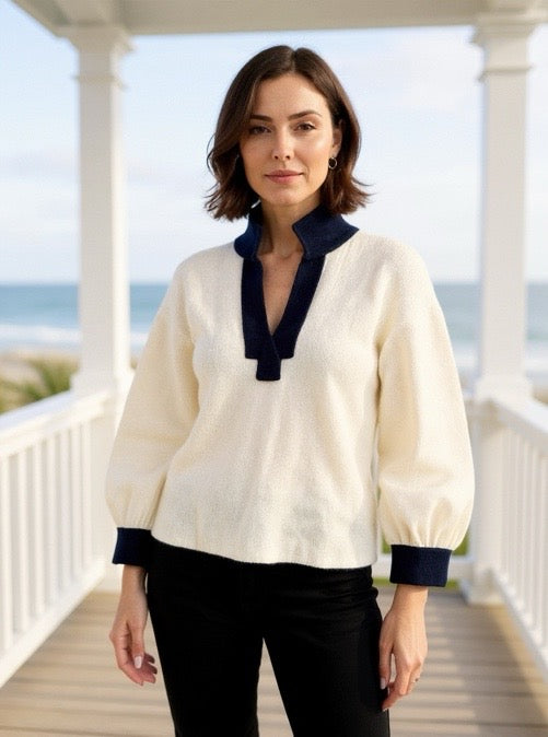 V Neck Contrast Trim Sweater in White and Navy by Patty Kim