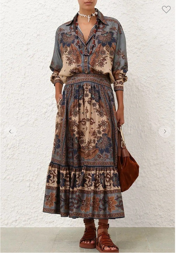 Fall Floral Print Long Sleeve Shirt and Midi Skirt