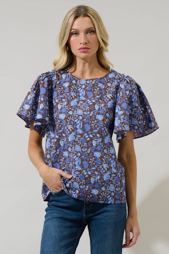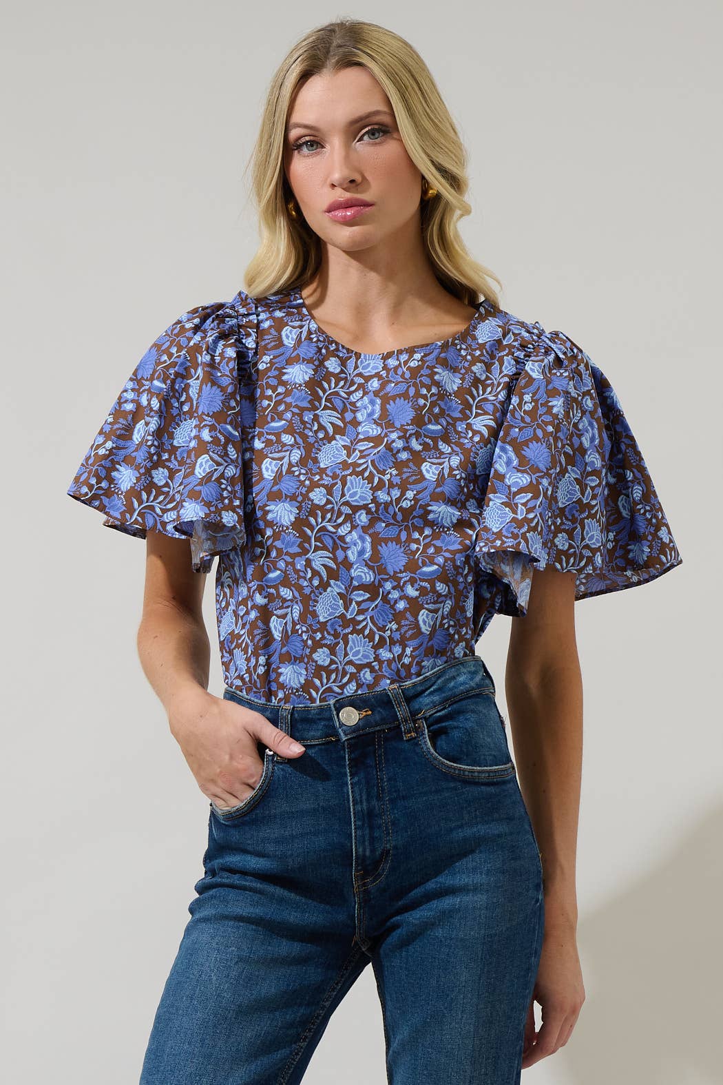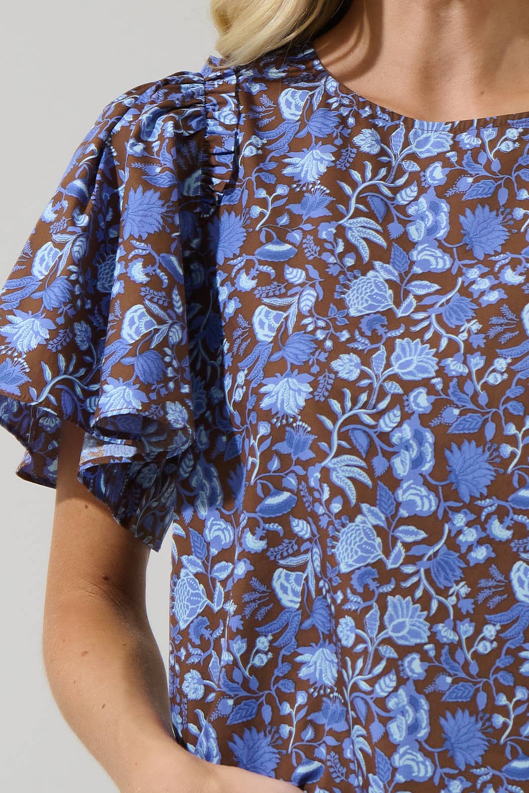 Introducing the Bruceton Floral Tune Puff Sleeve Top, with a brown background and blue ditsy florals. It has a round neckline, puff short sleeves, and ruffle details on the shoulders. A keyhole in the back makes it easy to get in and out.
