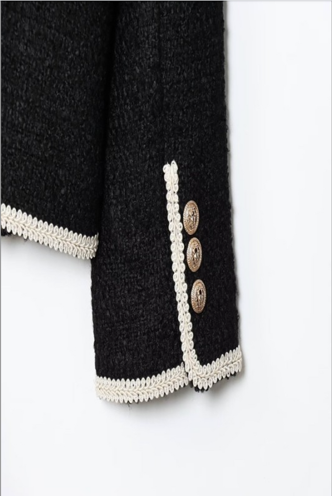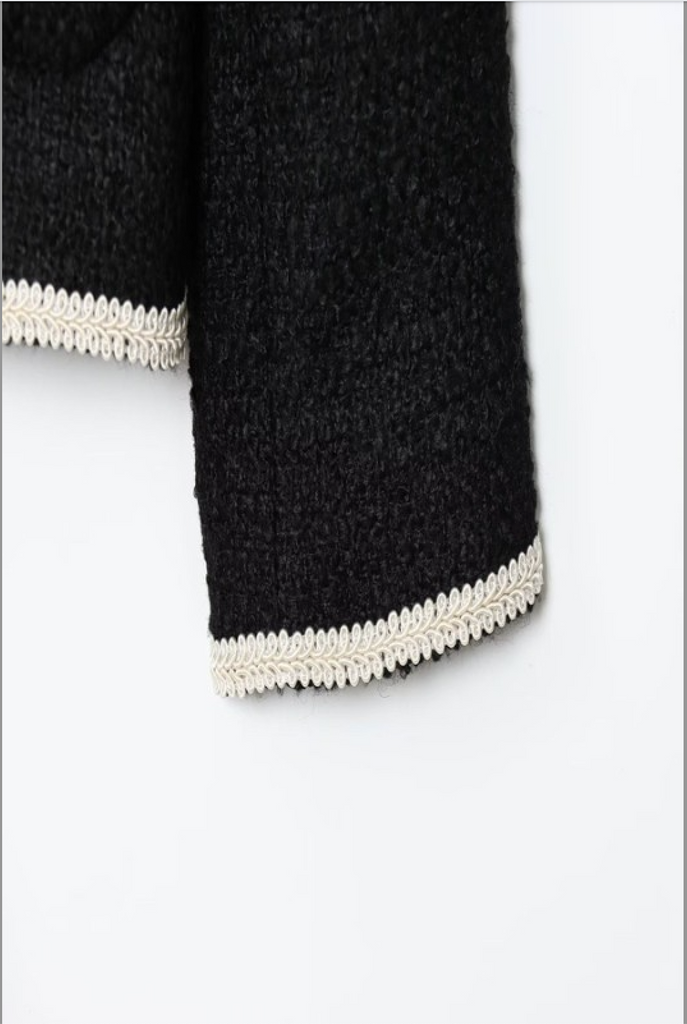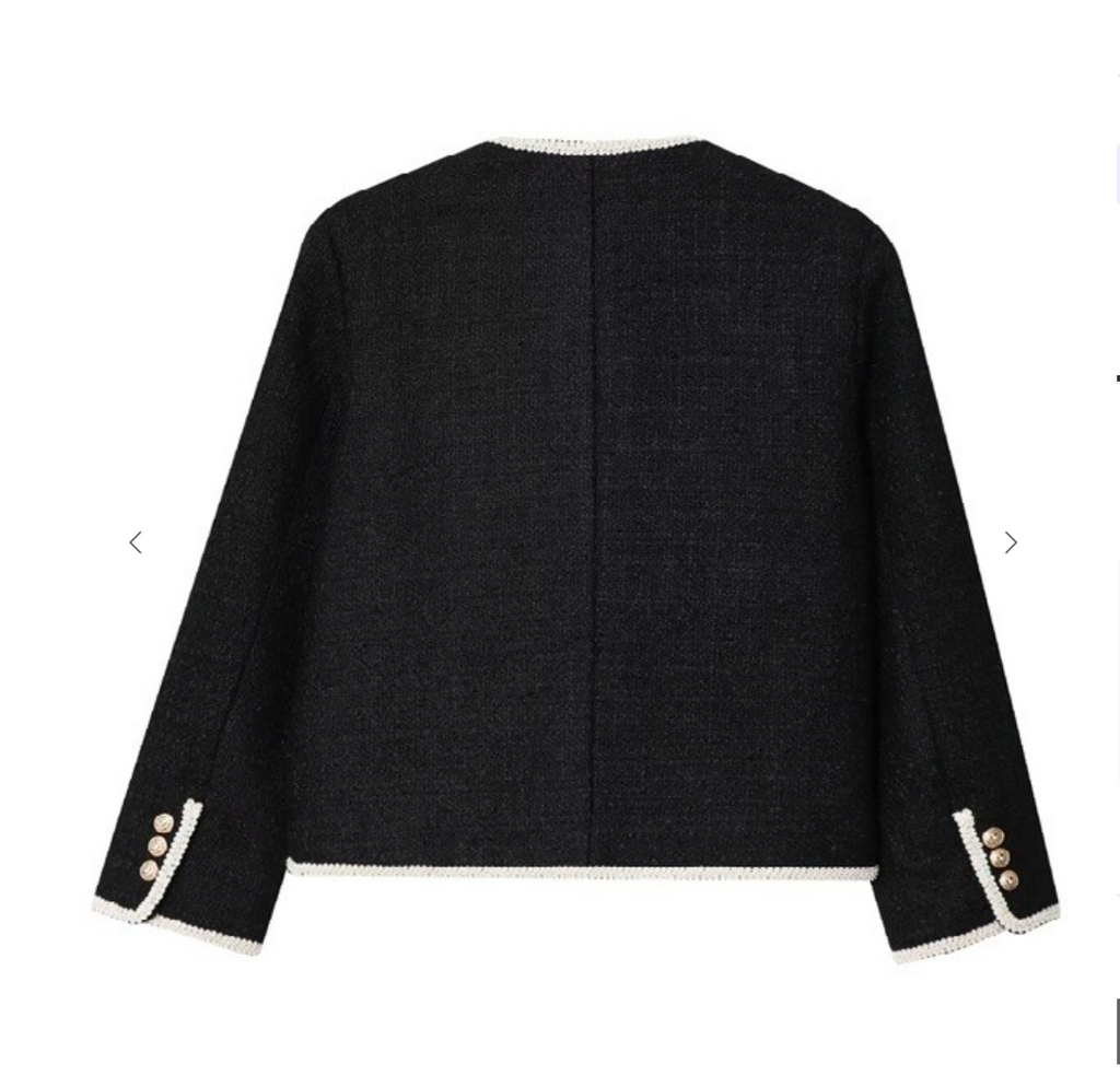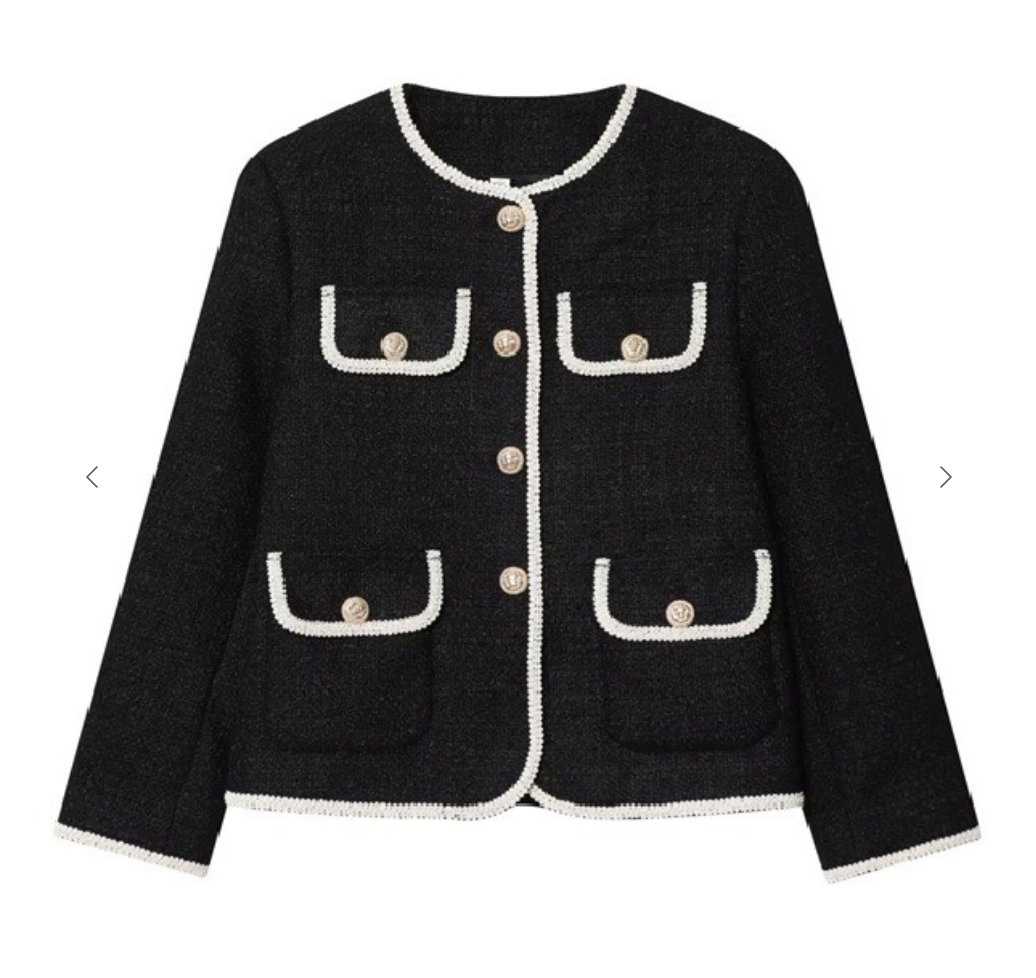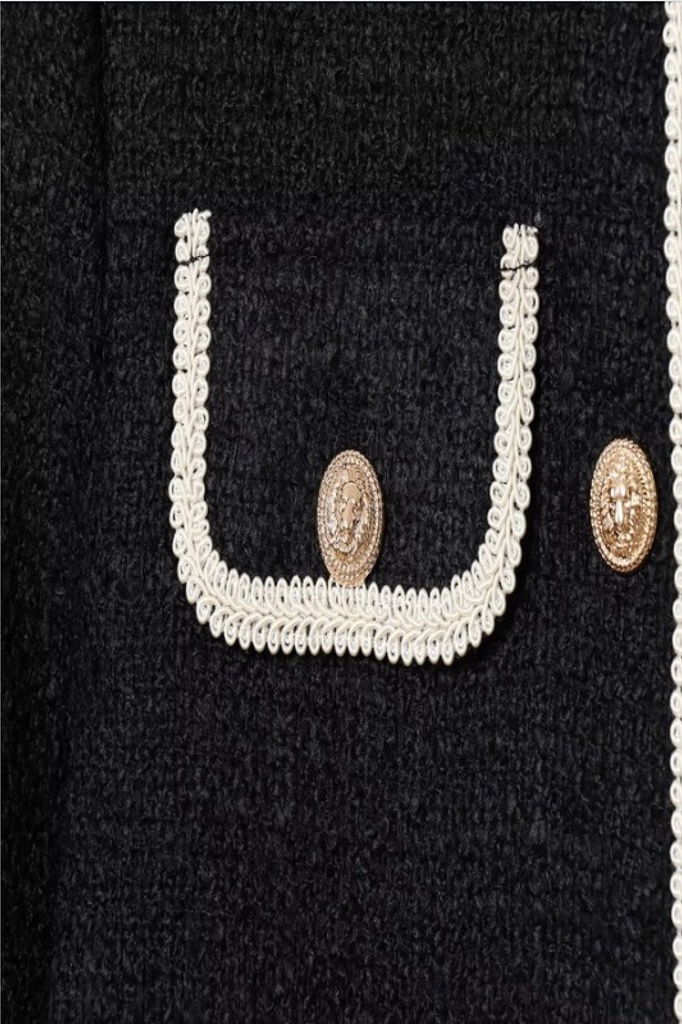 This solid round neck tweed jacket with gold buttons offers a classic and chic look, enhanced by contrasting trim detail for added style. Featuring beautiful casual patch pockets and a short cut, it combines fashionable design with everyday practicality, making it perfect for elevating your outerwear collection.