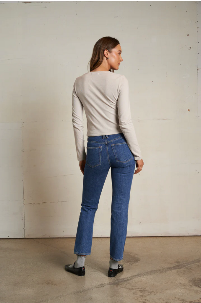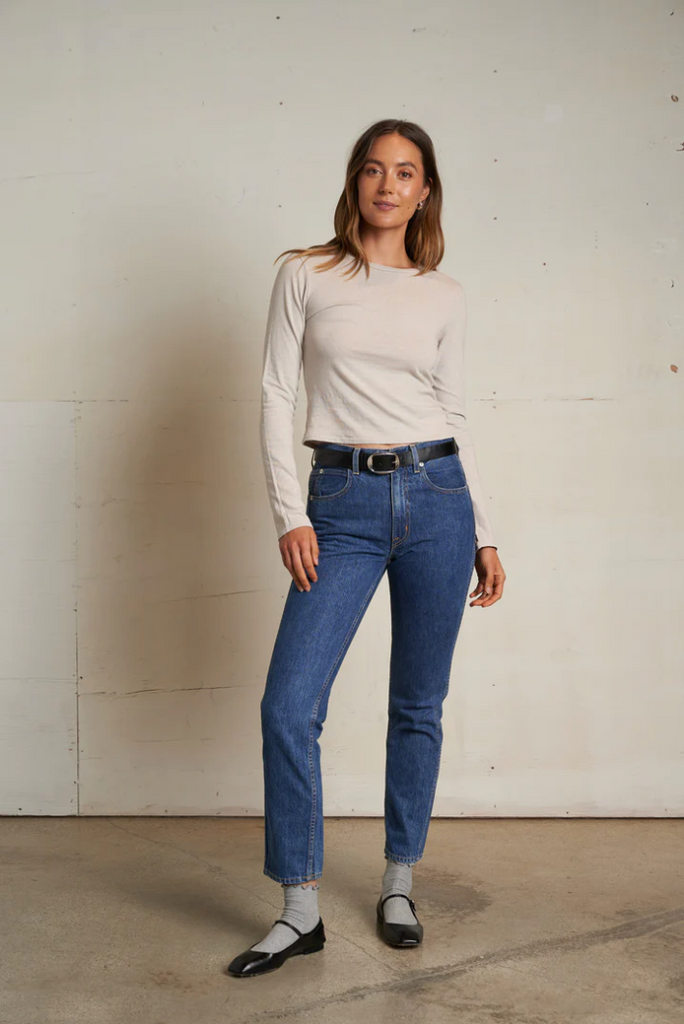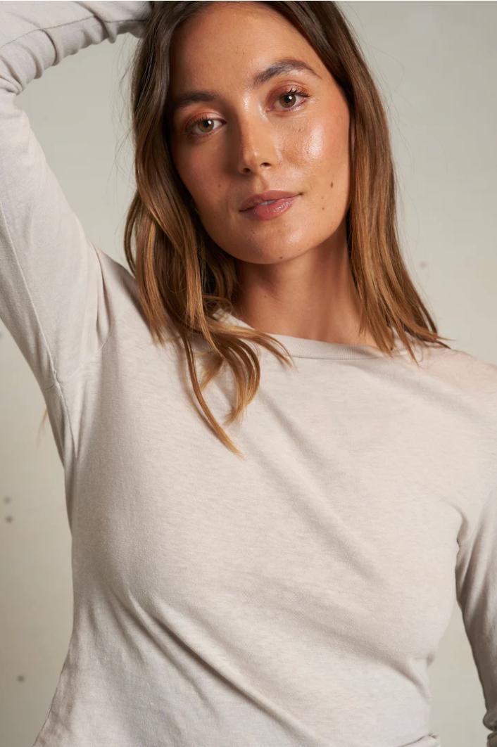 you loved the lisa tee—so we gave her sleeves. this long-sleeve version is made from recycled cotton with a body-skimming fit that hits right at your natural waist. full length, never cropped, and ready to be on heavy rotation.