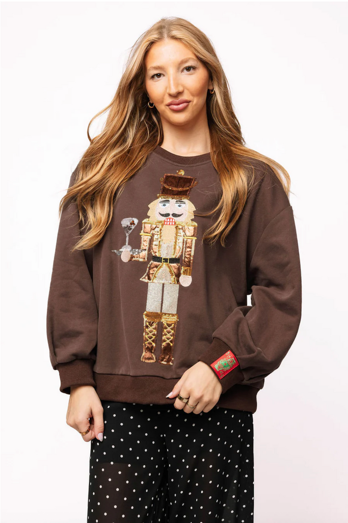 Get ready to sparkle and sip in style with the Queen of Sparkles sweatshirt! This playful brown sweatshirt features a charming nutcracker serving up an espresso martini, blending festive fun with cozy comfort. Perfect for adding a dash of whimsy to your holiday wardrobe or lounging with a smile, it’s your new favorite way to shine and celebrate.