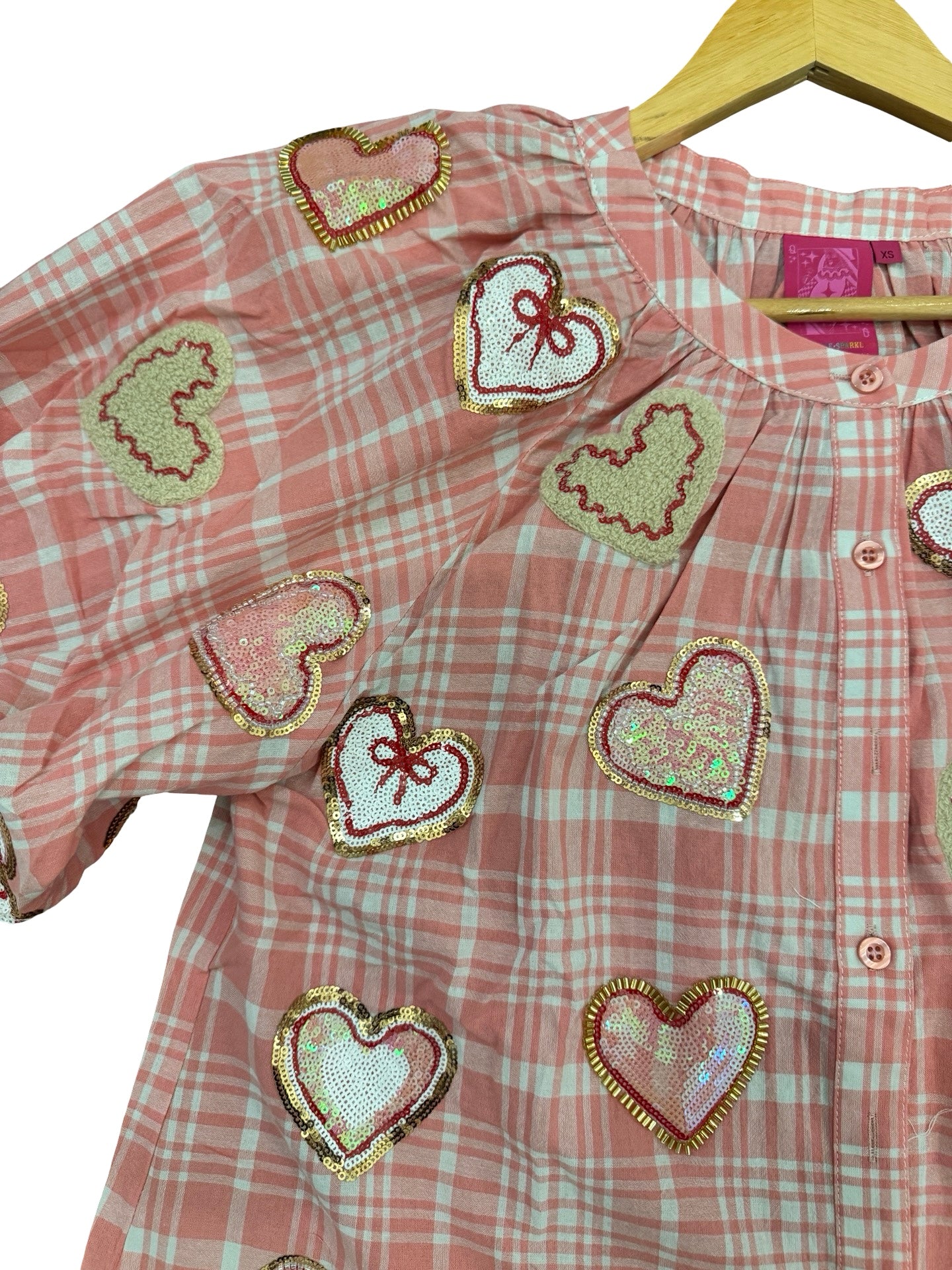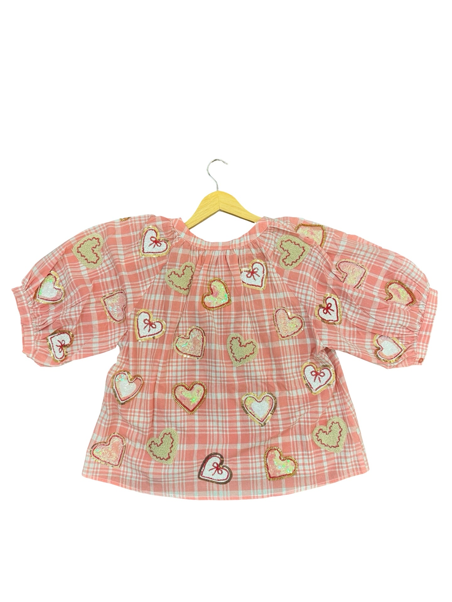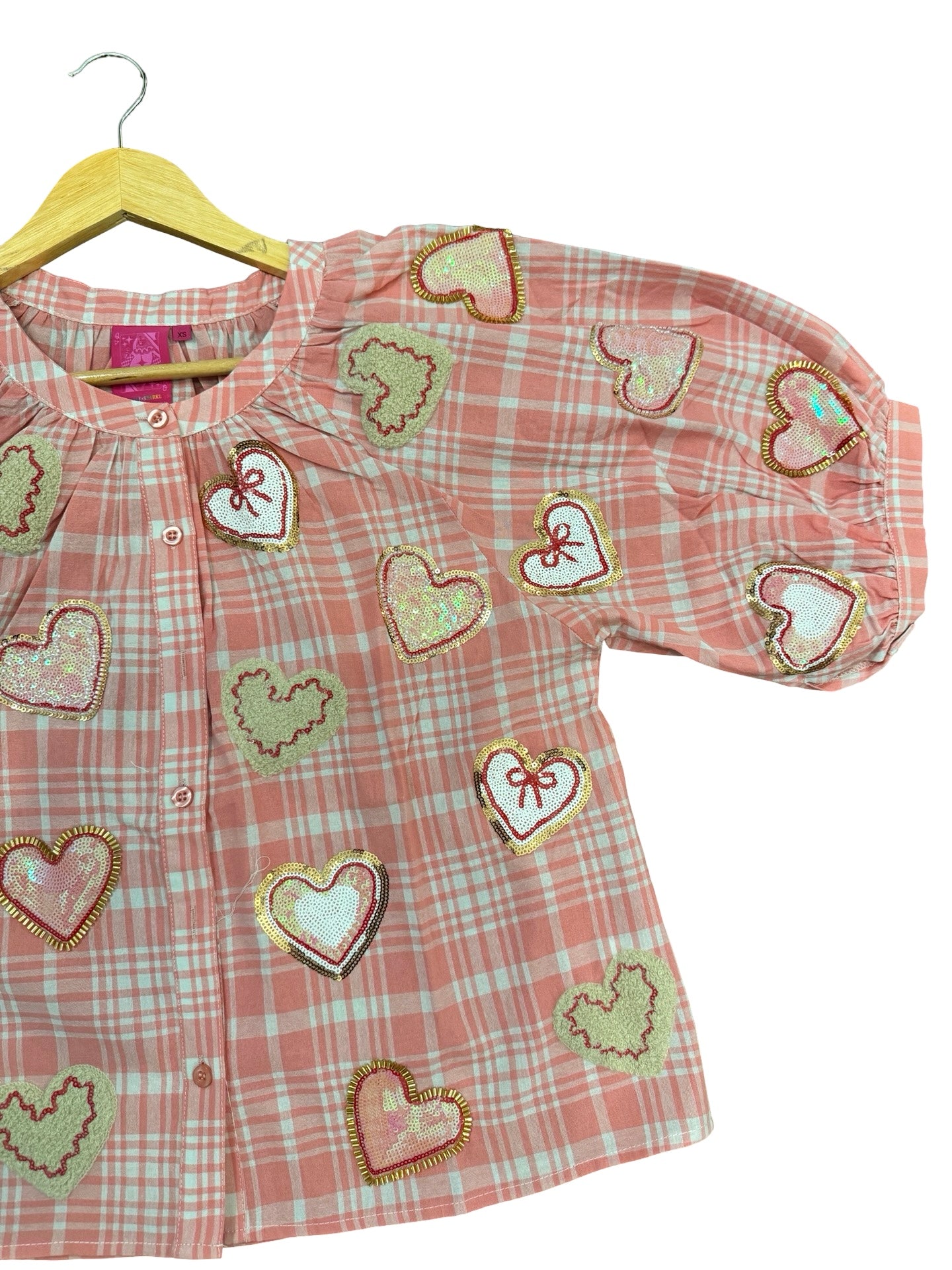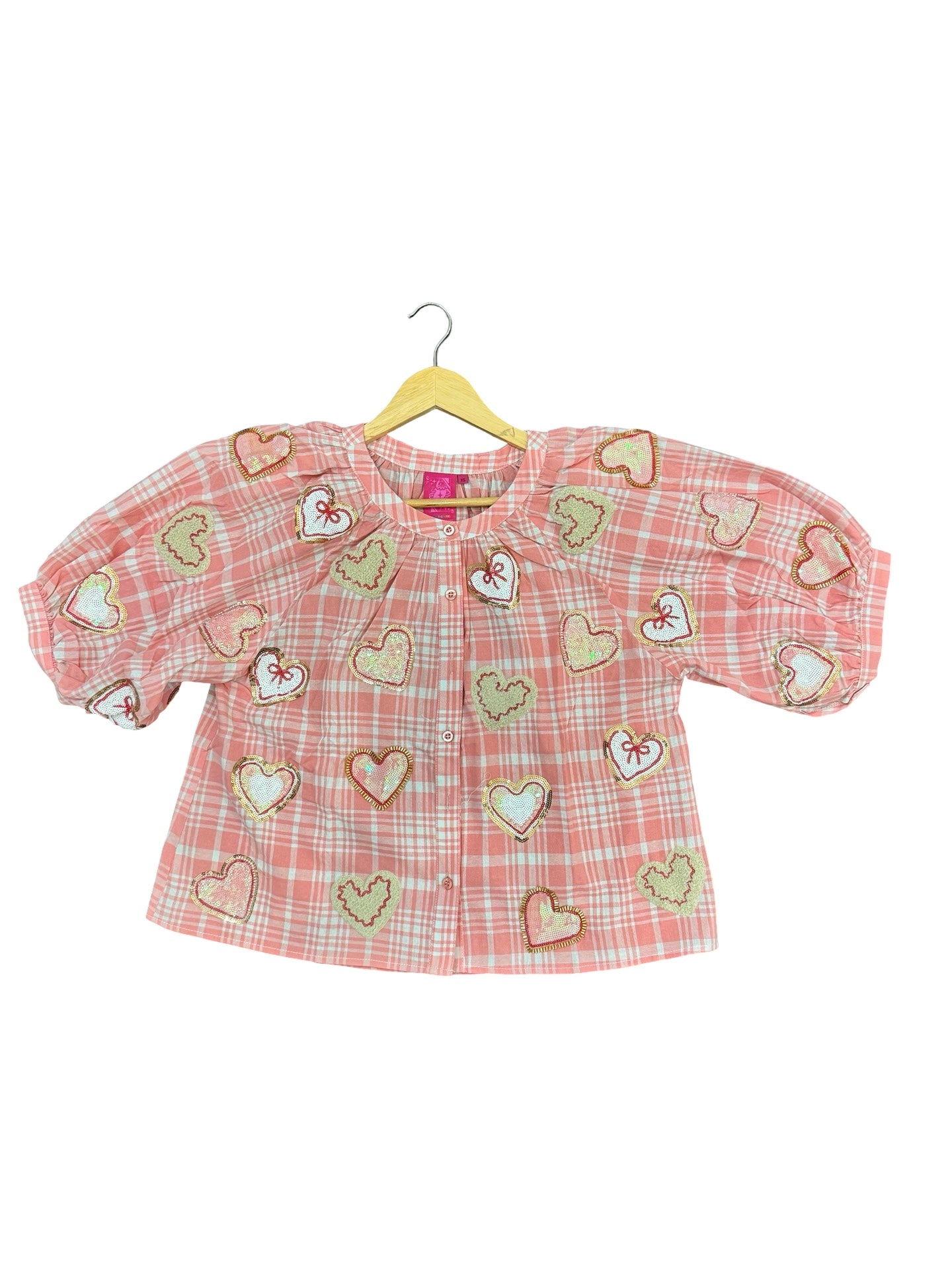 Elevate your wardrobe with this enchanting Queen of Sparkles button-up top in soft light pink. Featuring playful plaid heart cookie designs adorned with luxe chenille and sequin embellishments across the front and back, this piece delivers instant glamour and whimsy. The charming puff short sleeves add a feminine touch perfect for layering or wearing solo.