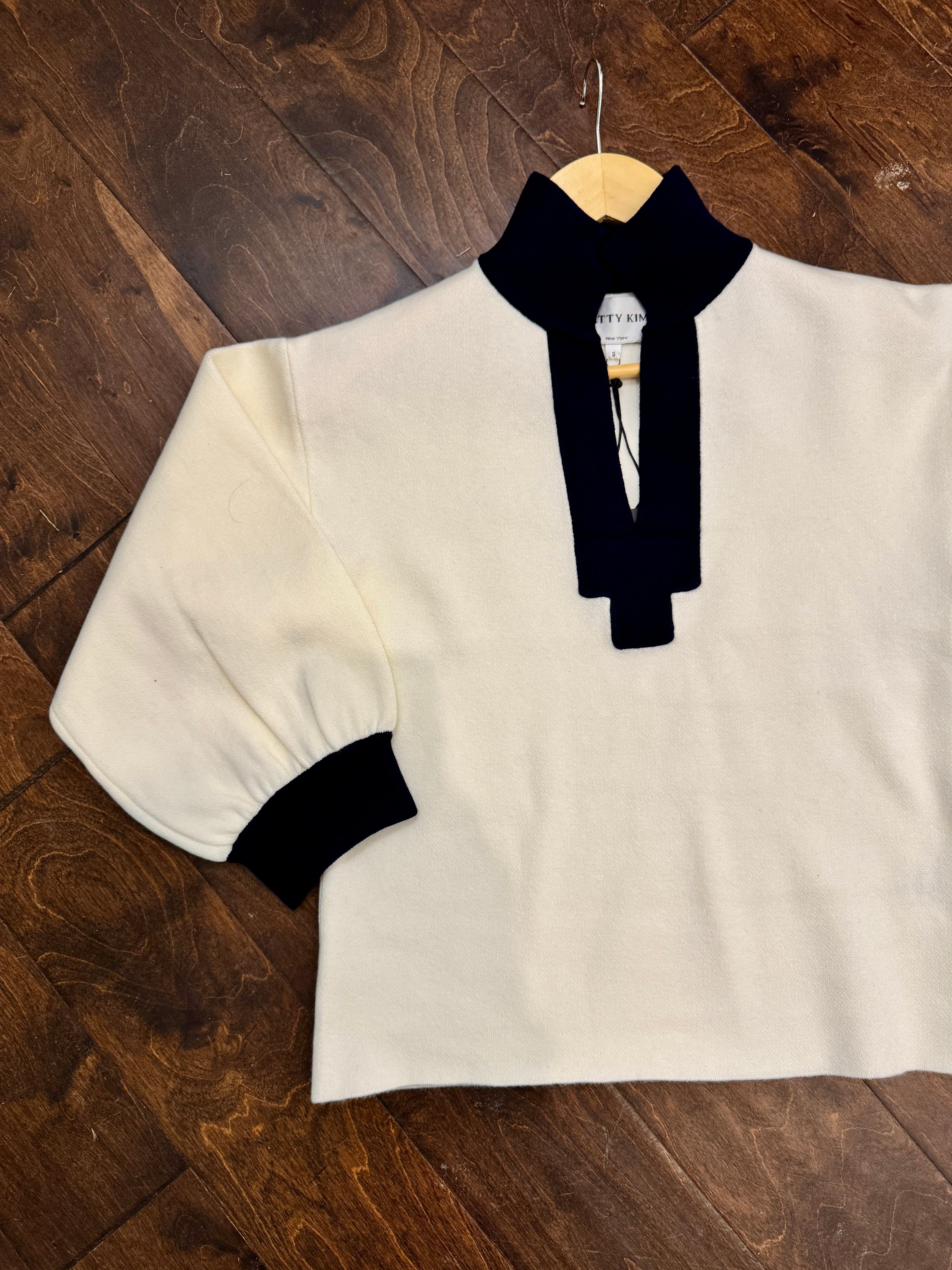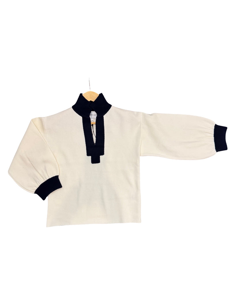 V Neck Contrast Trim Sweater in White and Navy by Patty Kim
