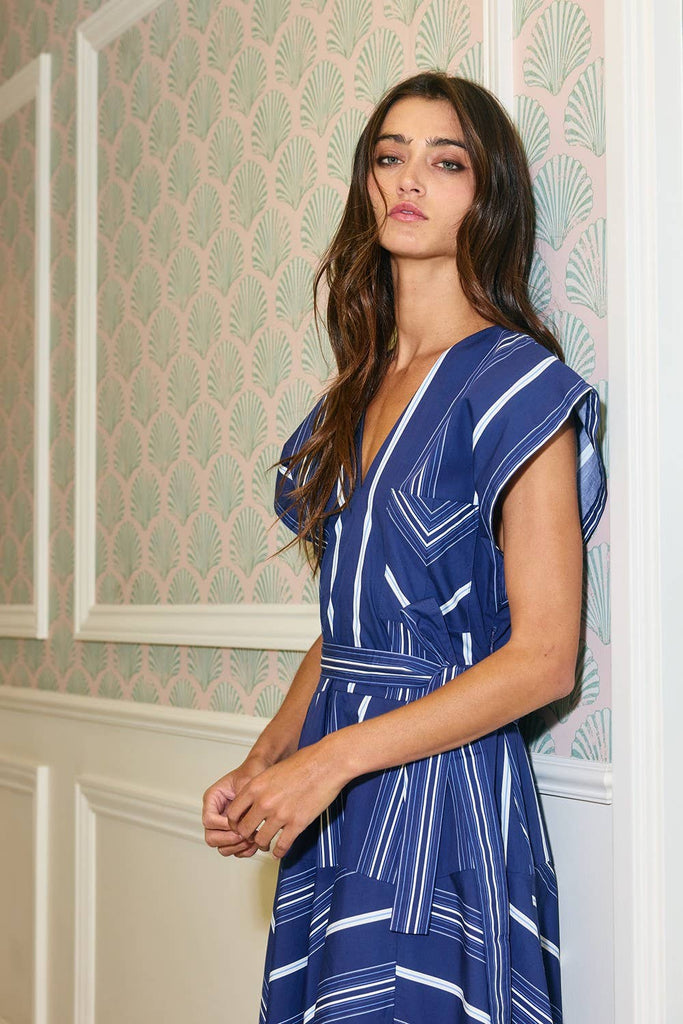 Striped V-neckline Wrap Style Midi Dress in Navy Blue