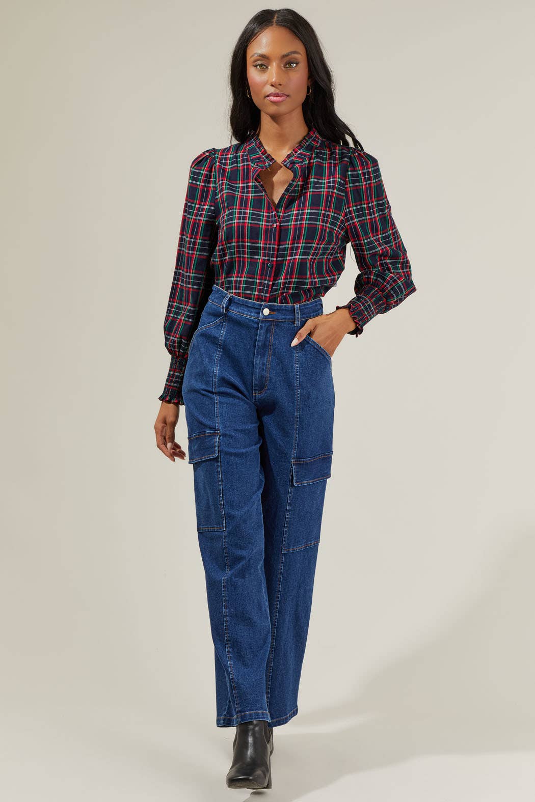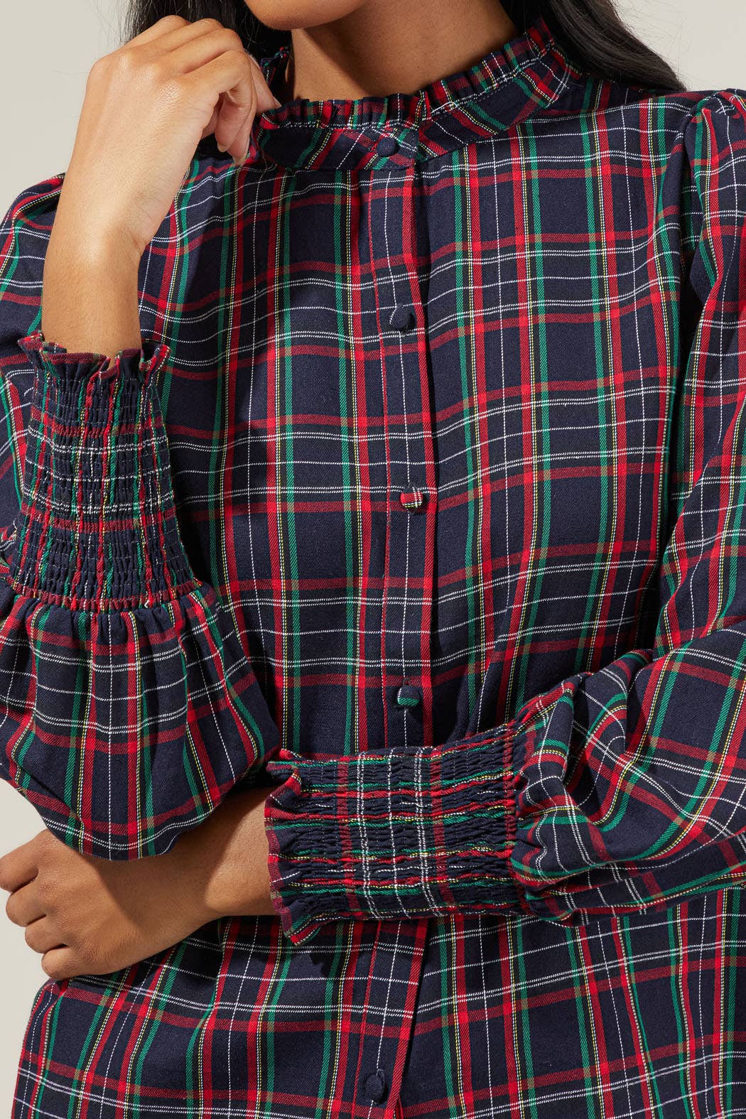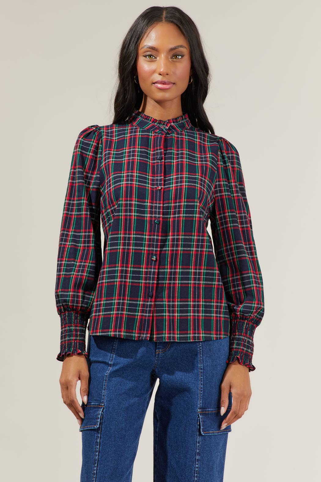 Long, slightly puff sleeves feature smocked cuffs along with a button down feature to wear as mock neck or unbutton down for a more open style.