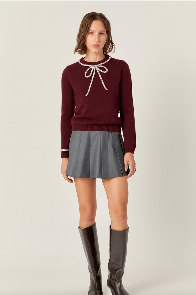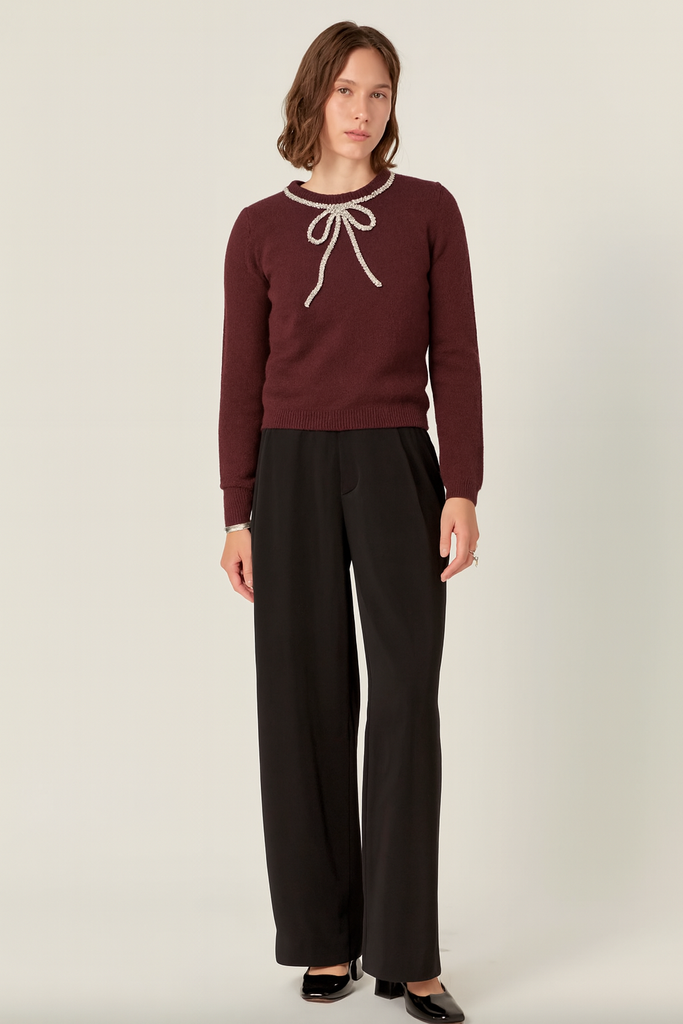 Be effortlessly chic in our Rhinestone Bow Knit top perfect for any occasion. The round neckline and long sleeves make it comfortable and versatile. The eye-catching rhinestone and pearl bow embroidery on the neckline adds a touch of elegance. With a back keyhole and clear button closure it's easy to put on and take off. The elastic closure ensures a perfect fit for all body types. Made with high-quality materials this top is sure to become a staple in your wardrobe. Get ready to turn heads with this must-have top that combines style and comfort.
