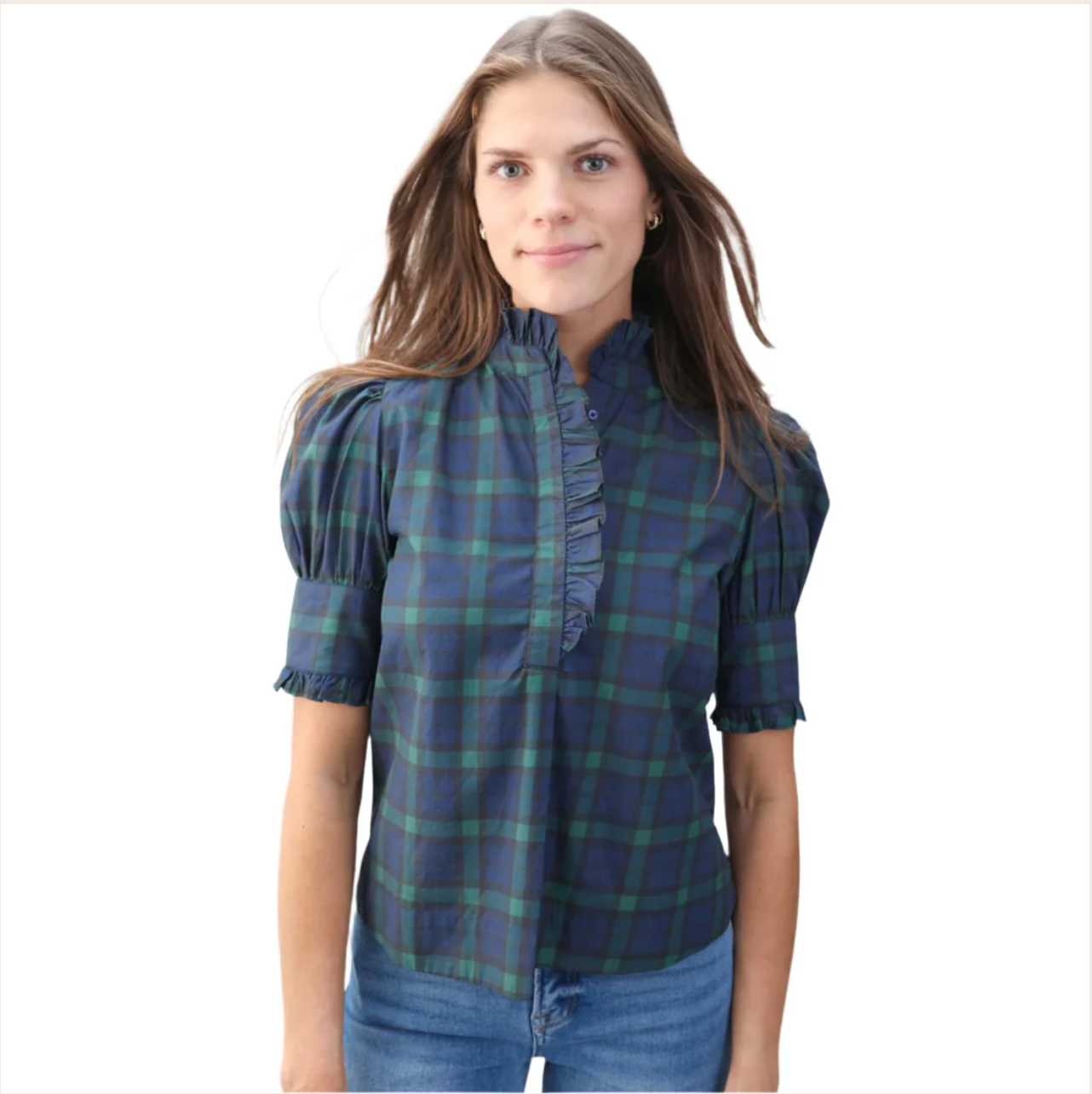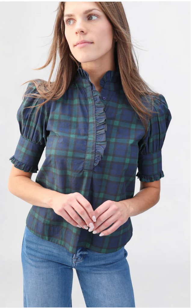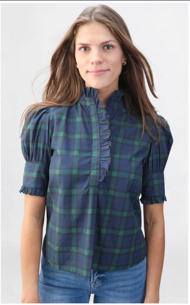 Celebrate the season in style with this blue and green holiday plaid top featuring a charming ruffled neck collar and flattering short sleeves. At 24" in length, it offers a comfortable, versatile fit perfect for festive gatherings. Designed to enhance your look with a touch of playful elegance, this piece pairs beautifully with your favorite holiday outfits. The model is wearing a size small for reference. Elevate your wardrobe with this season’s must-have holiday plaid top.