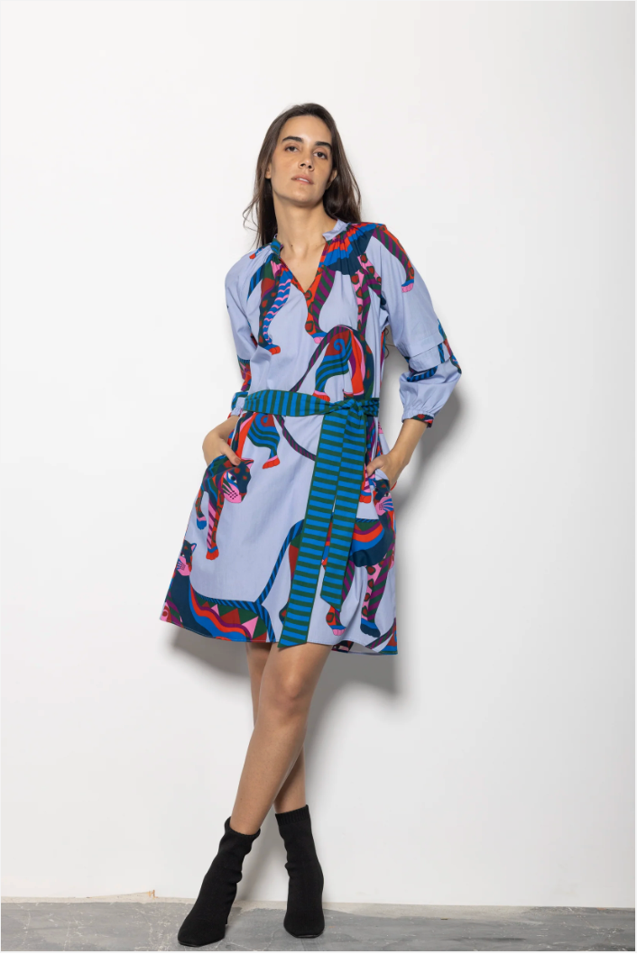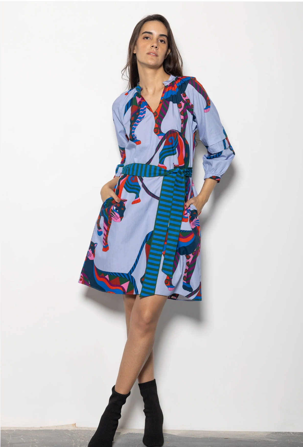 Elevate your wardrobe with the Gia Dress in Cheetah Mirage. Crafted from 100% cotton, this shirt dress features a flattering V-neck and stylish puff sleeves with double pleated details for a touch of sophistication. The coordinating sash belt cinches the waist for a perfect fit, while convenient pockets add practicality. Bold yet elegant, this dress combines comfort and chic design effortlessly.