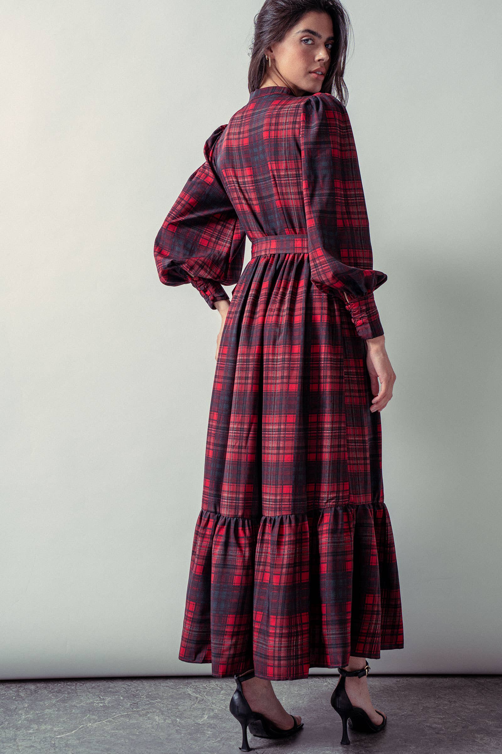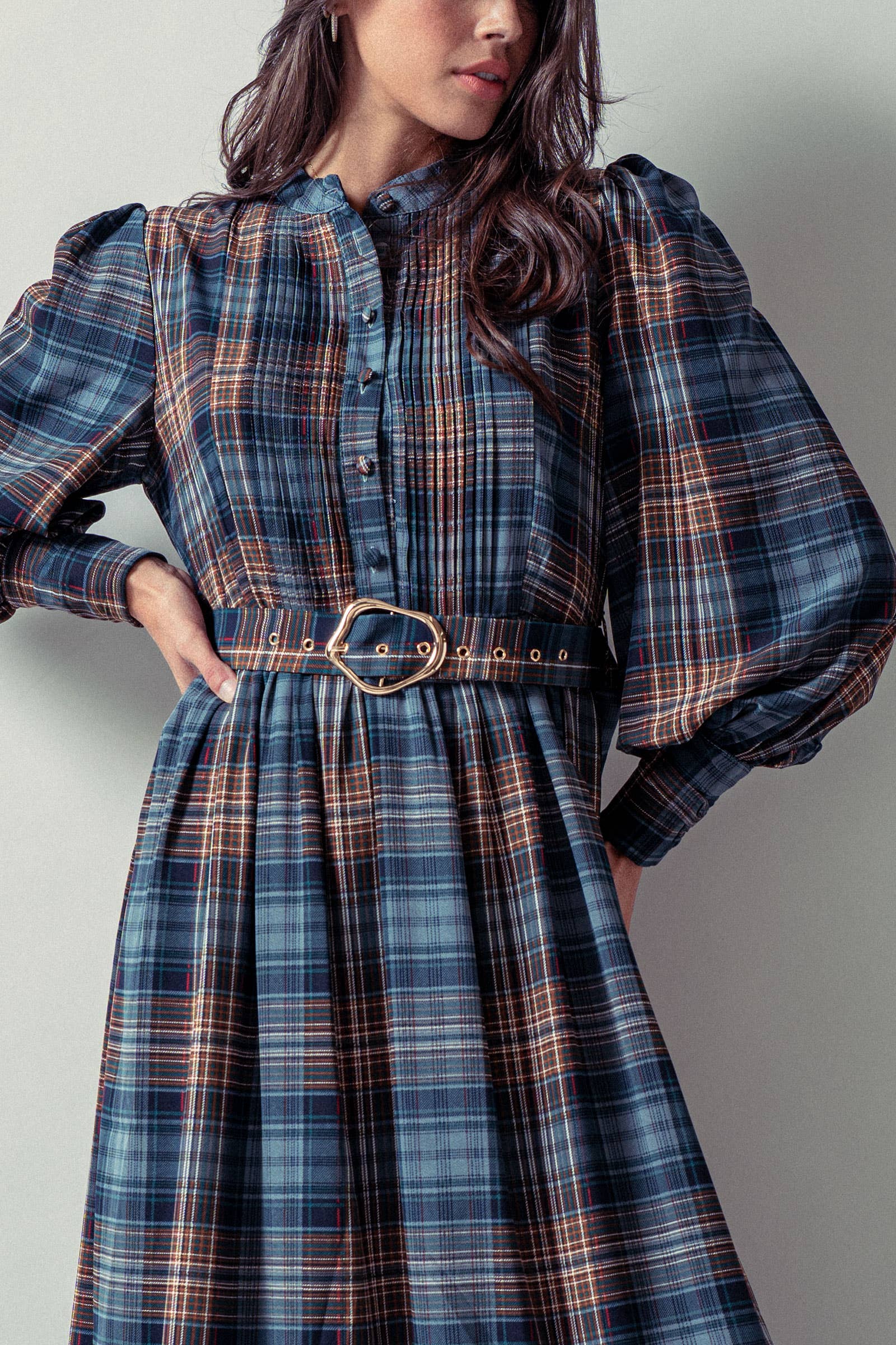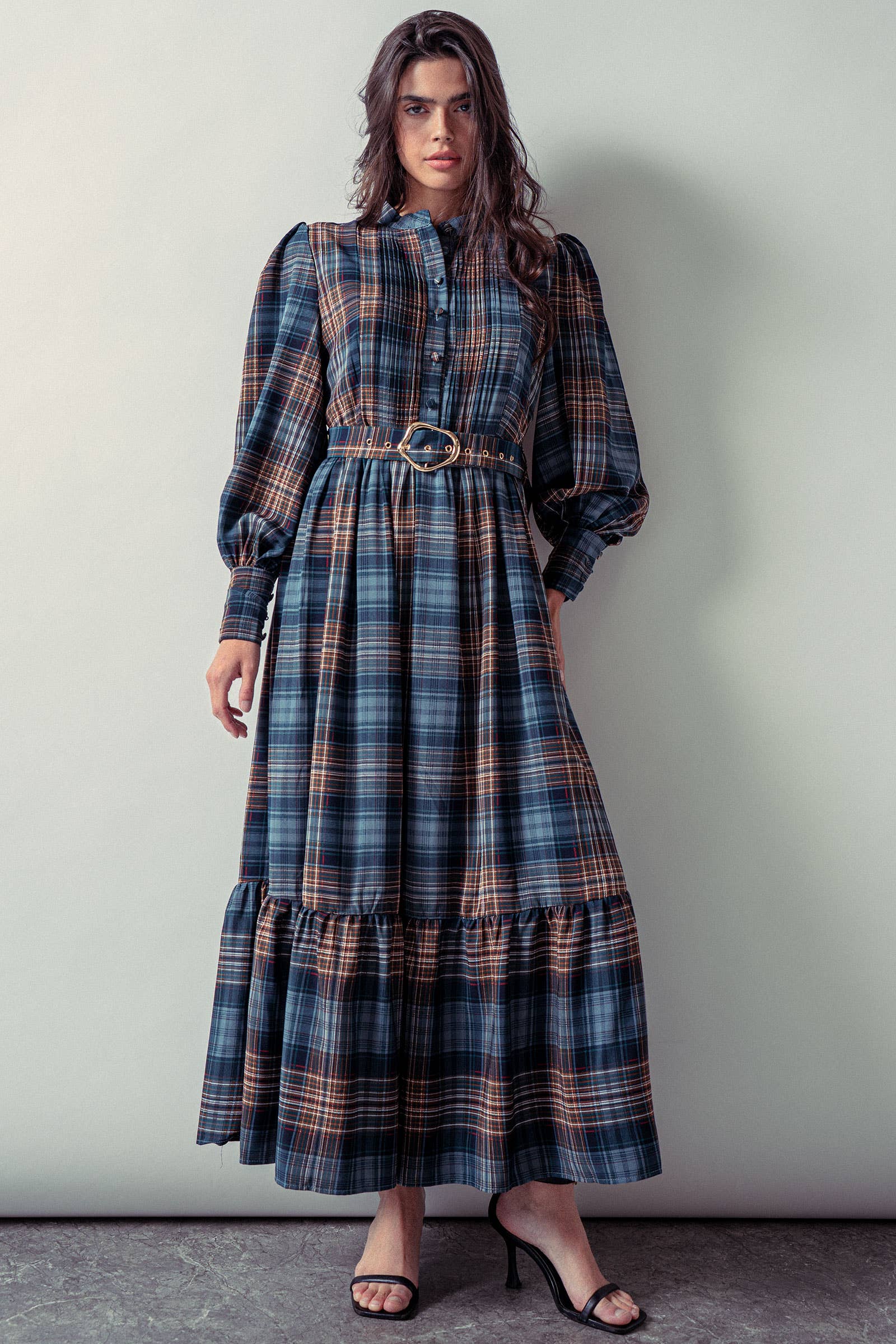 Plaid Belted Layered Button Down Balloon Sleeve Maxi Dress