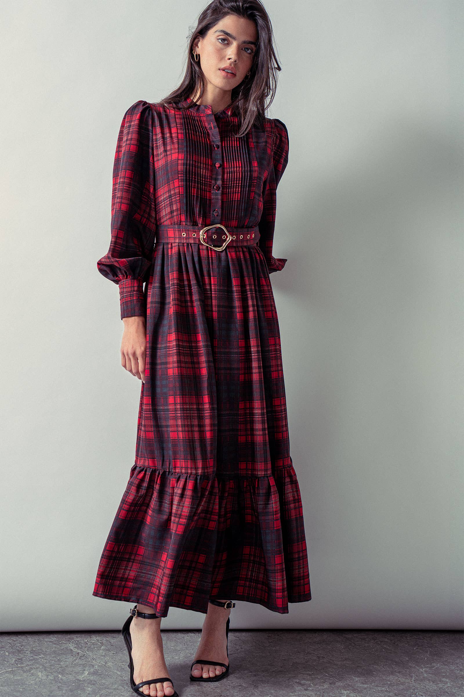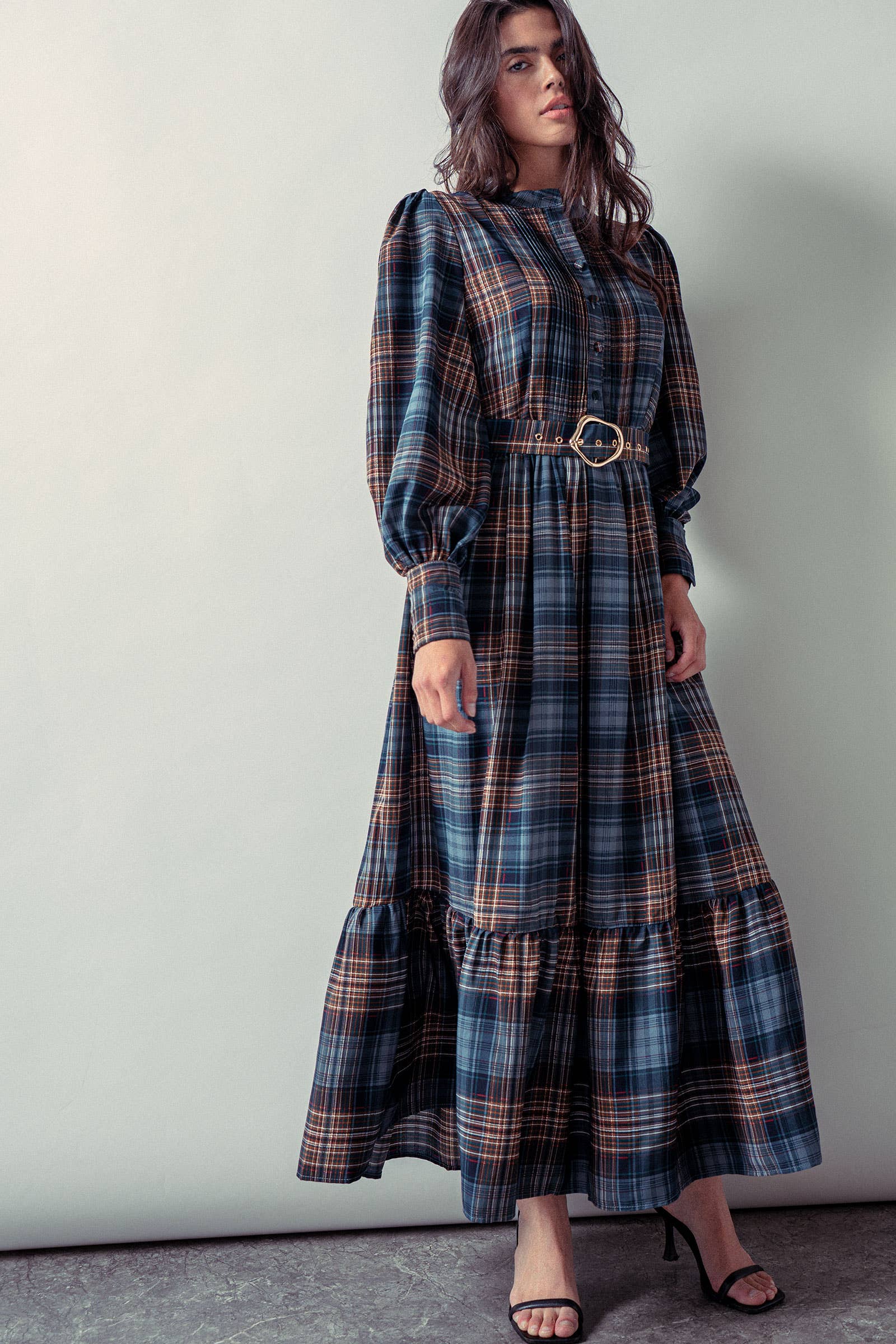 This elegant plaid maxi dress features a flattering belted waist, tiered skirt, and dramatic long balloon sleeves for a timeless silhouette. The button-down front and pintuck detailing add a polished touch, while the soft stretch fabric ensures comfort for any occasion.