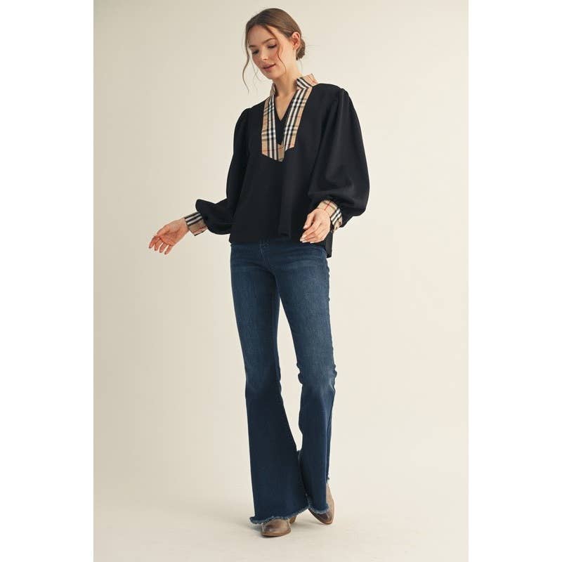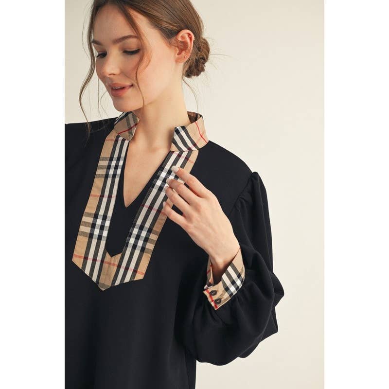 Elevate your style with our Plaid Contrast Mock Neck Top in Black! This long-sleeved top features a chic mock neck and trendy plaid contrast accents on the puff sleeves and button closure cuffs. Stay stylish and on-trend with this must-have piece.