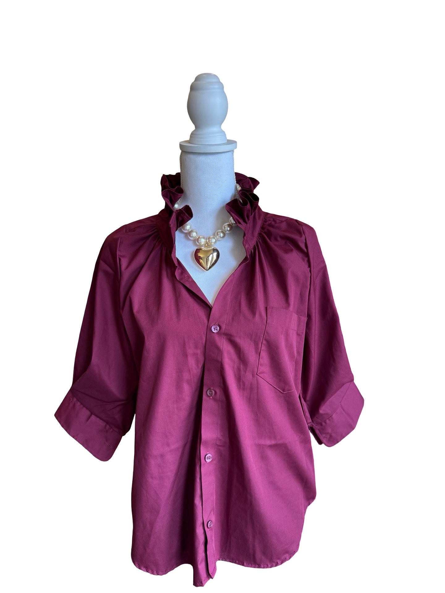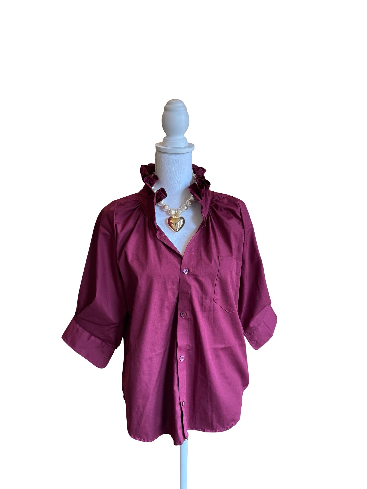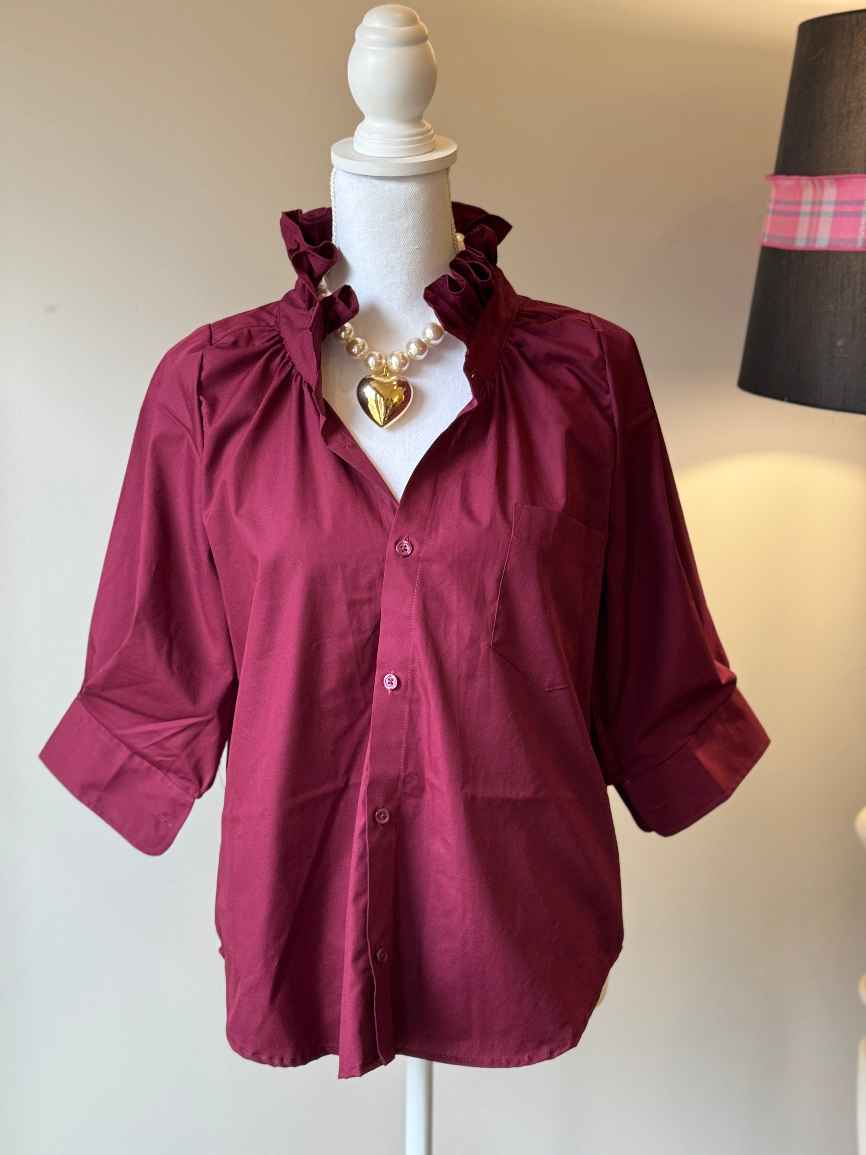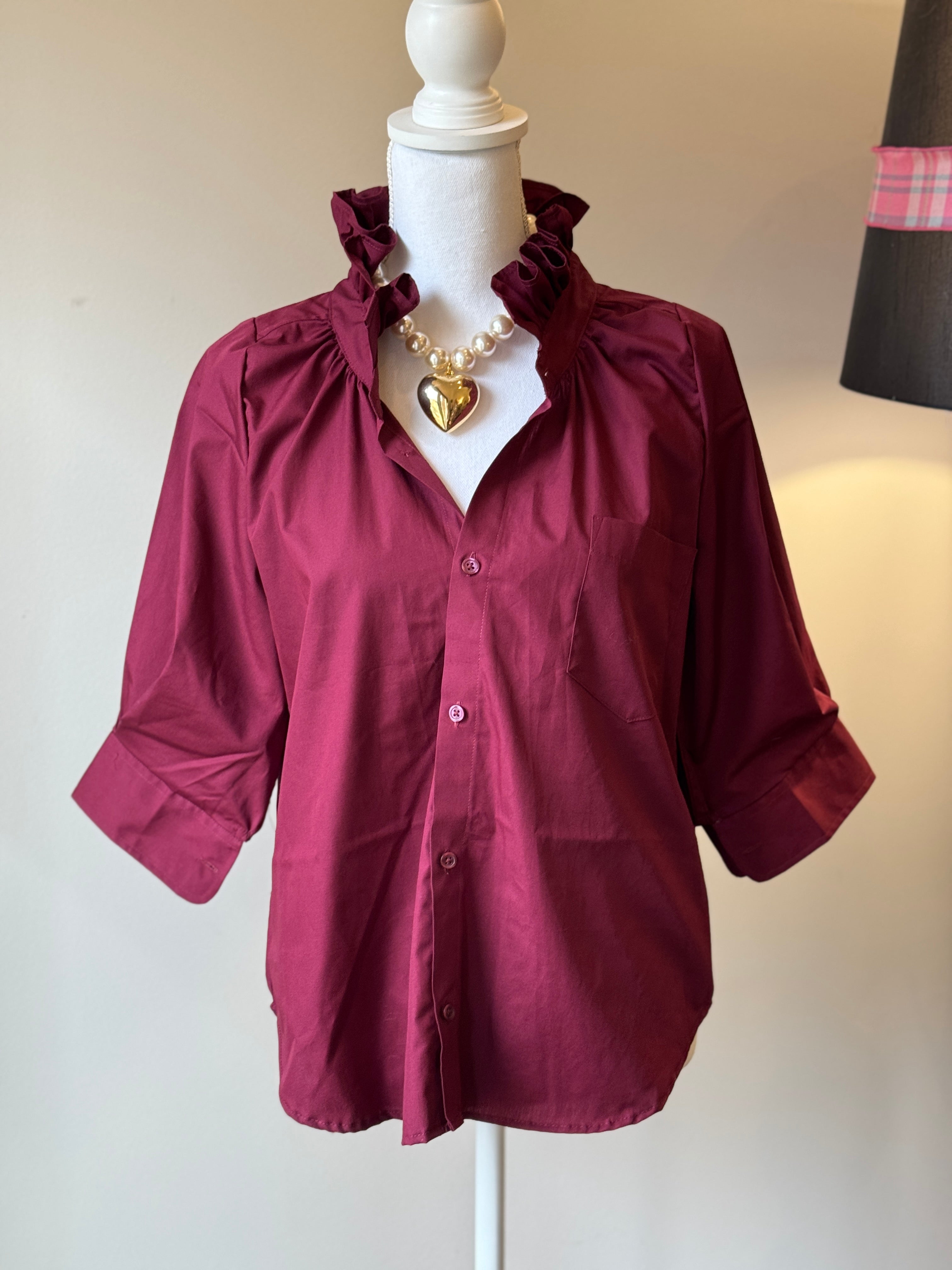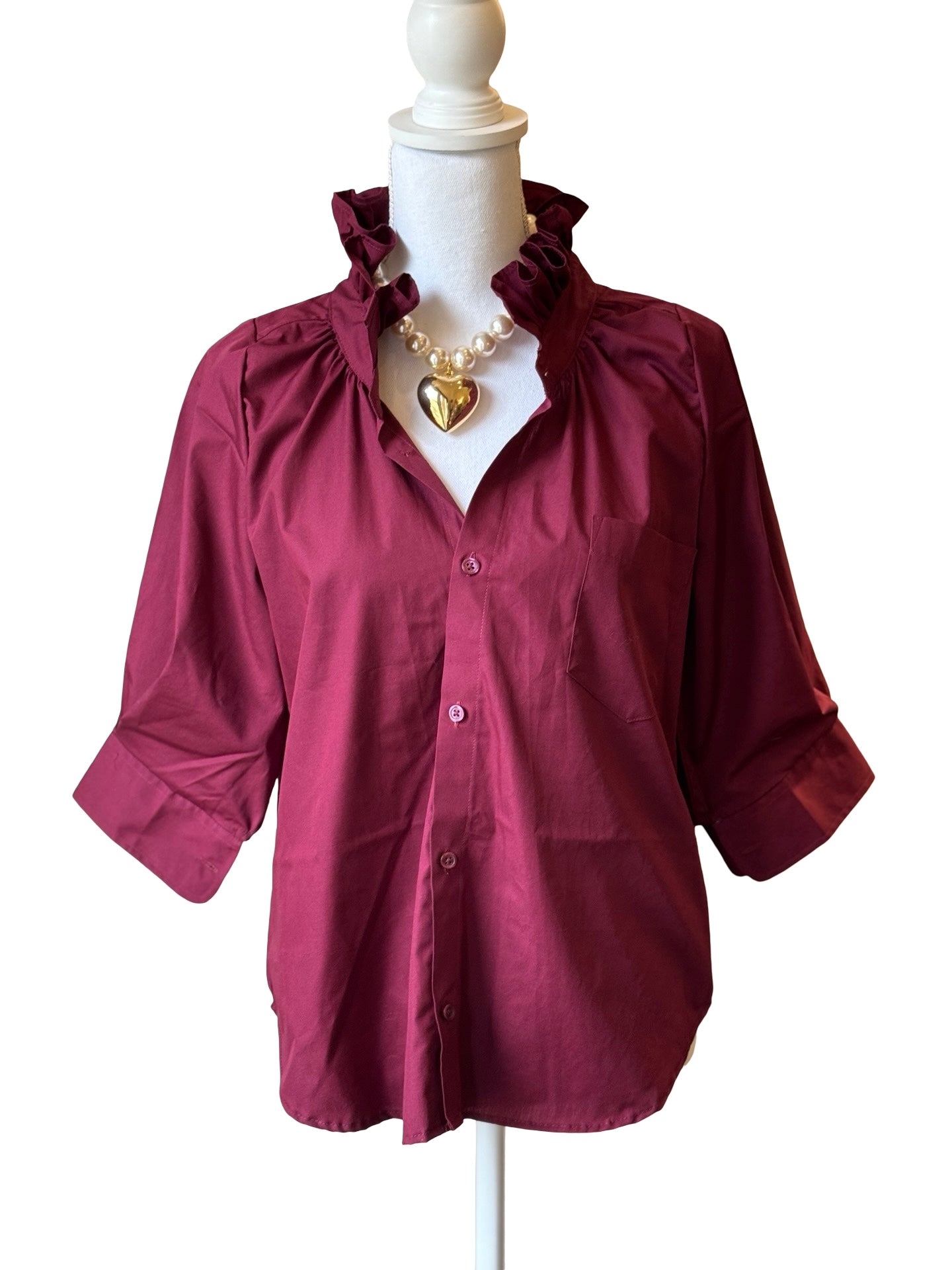 Hey, Southern Lover! This Southern-inspired delight has 3/4 puff sleeves that gracefully sit right above the elbow. Accentuated by an inverted pleat at the cuff and adorned with our signature ruffle collar, this gal gives you the confidence you need to conquer the day.