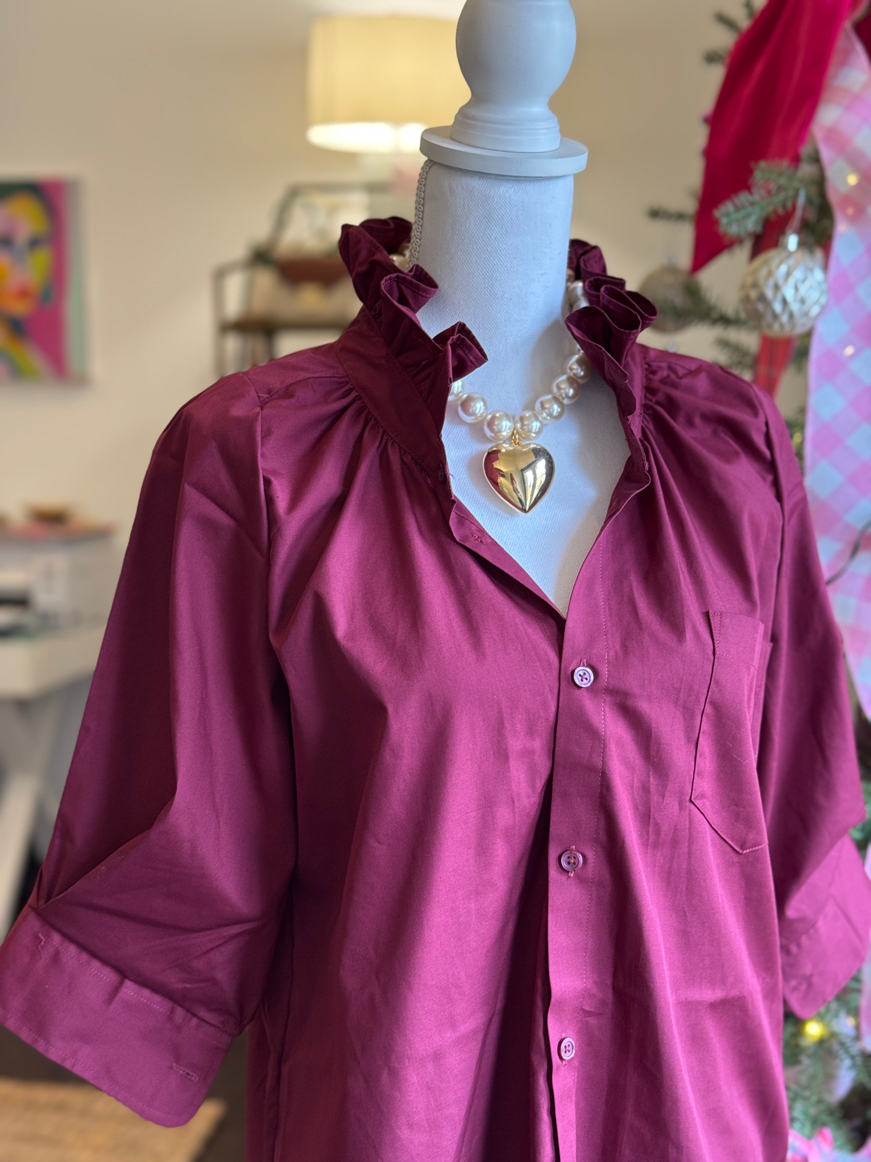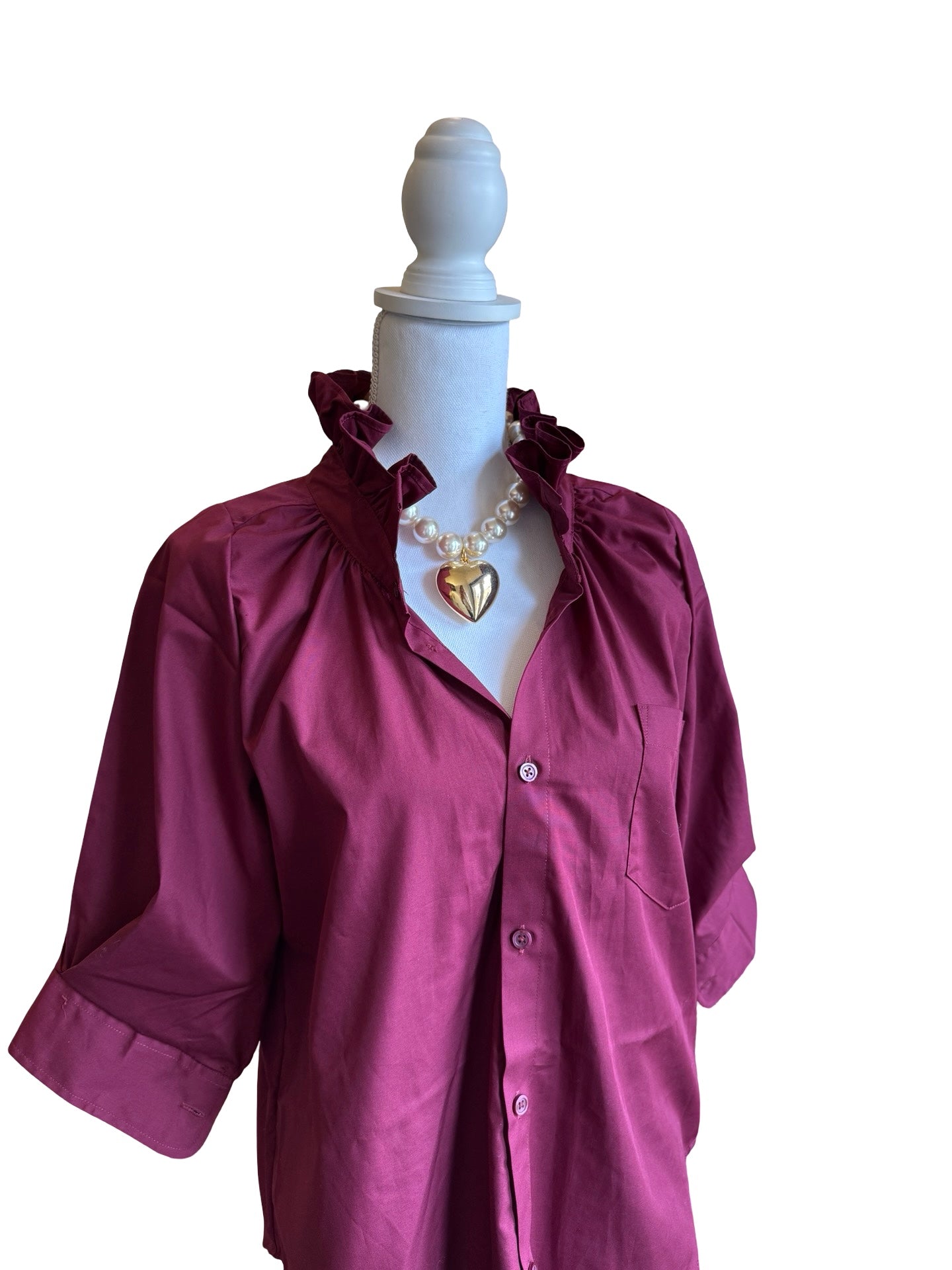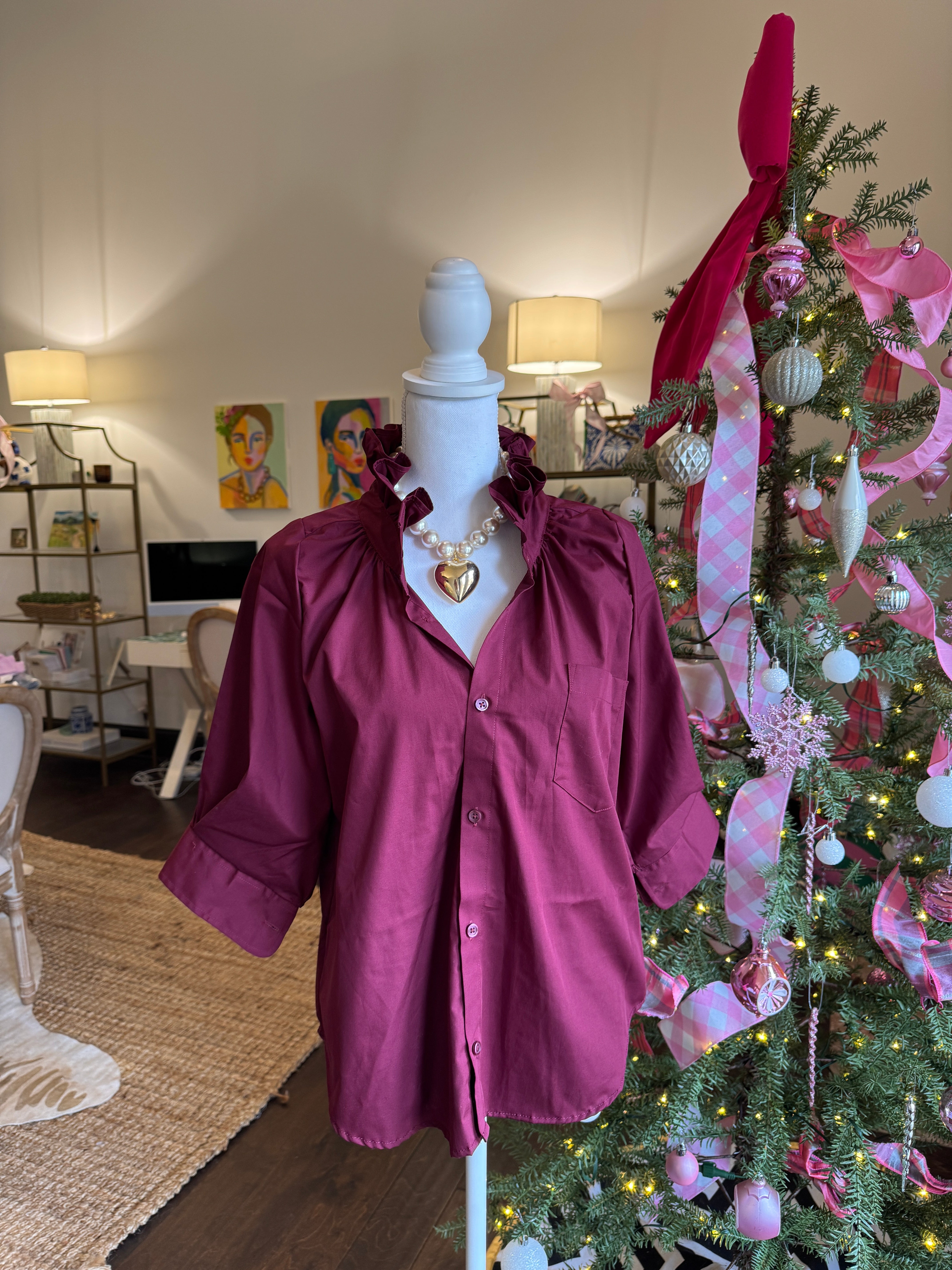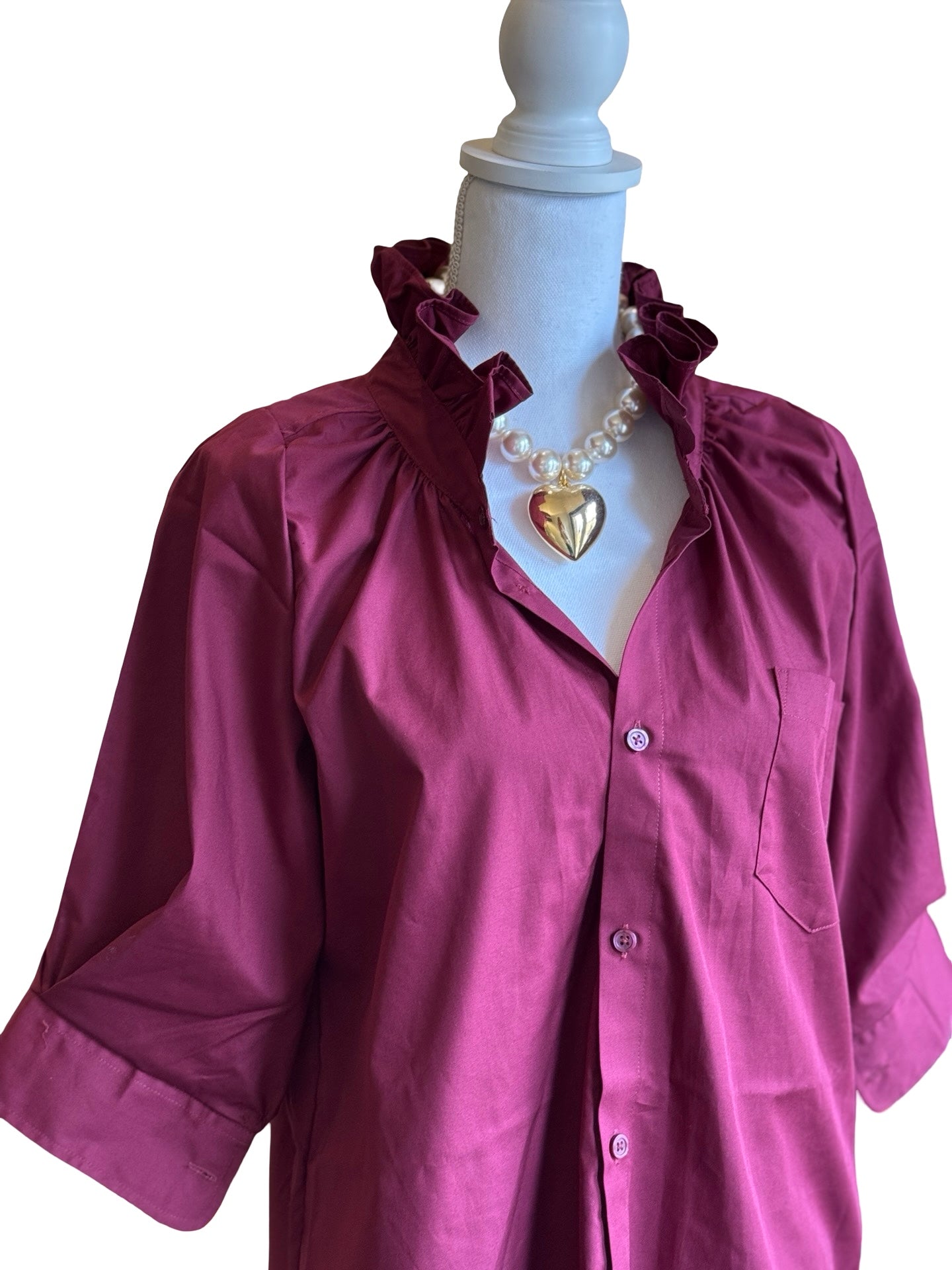 Hey, Southern Lover! This Southern-inspired delight has 3/4 puff sleeves that gracefully sit right above the elbow. Accentuated by an inverted pleat at the cuff and adorned with our signature ruffle collar, this gal gives you the confidence you need to conquer the day.