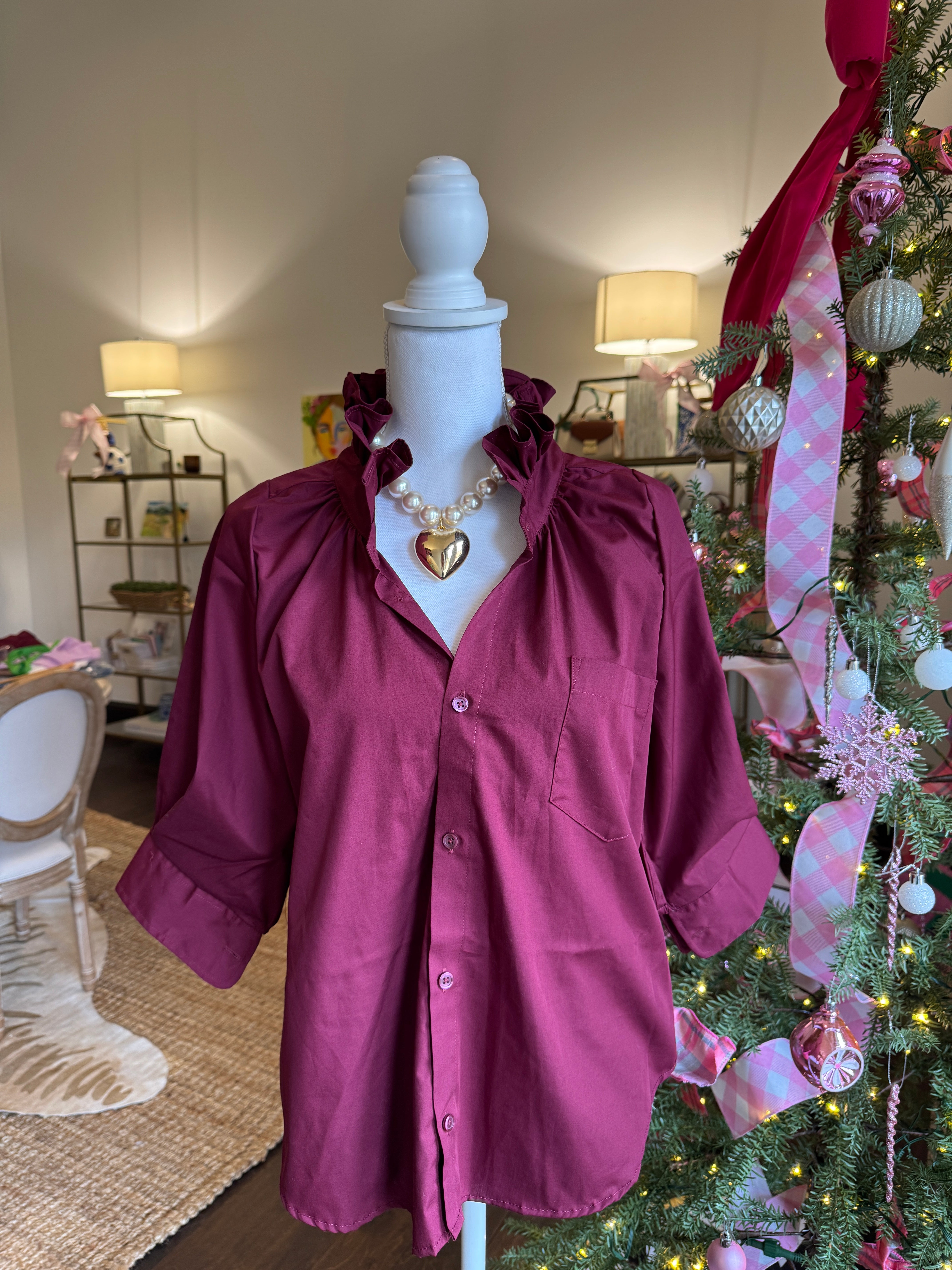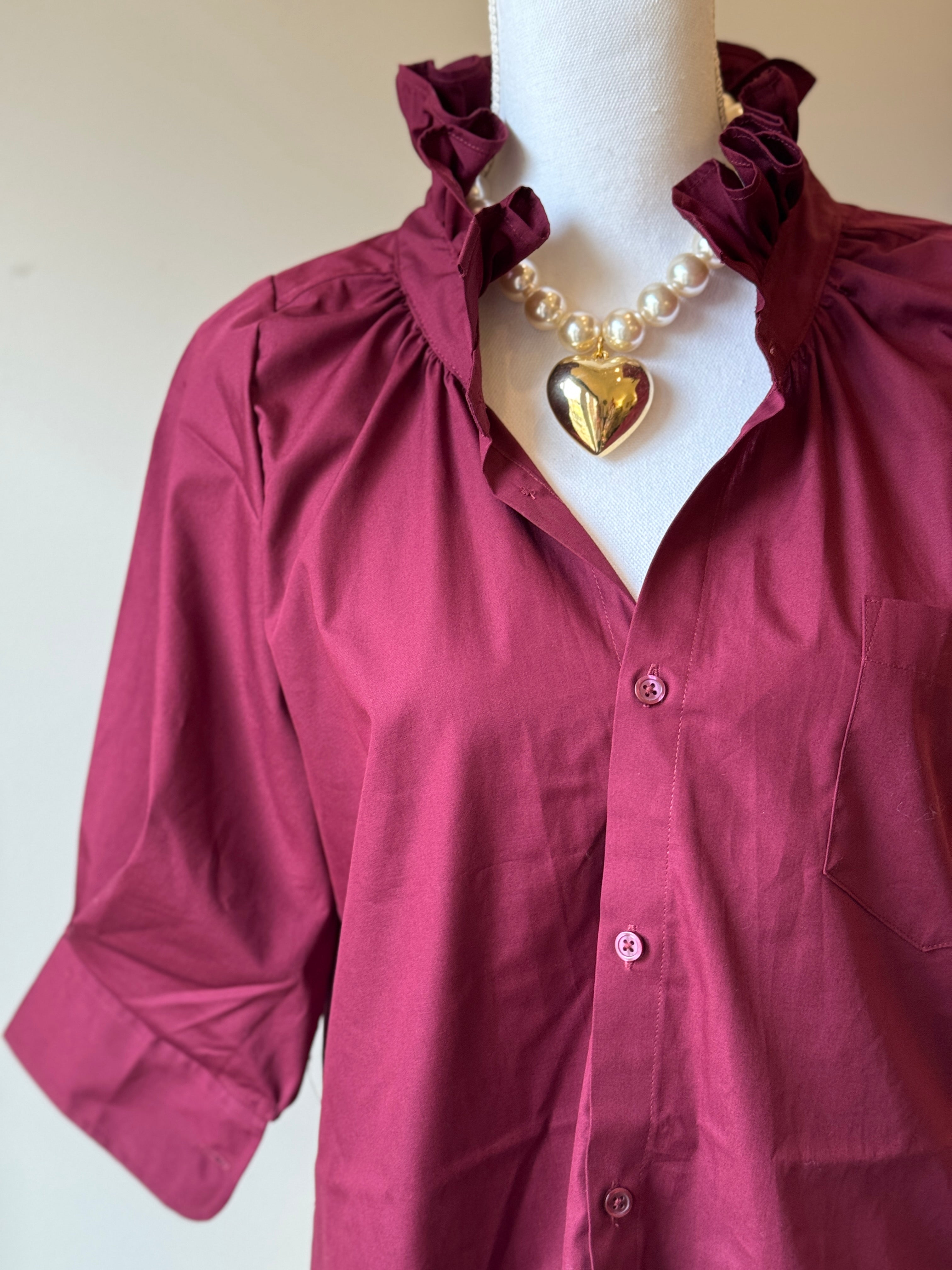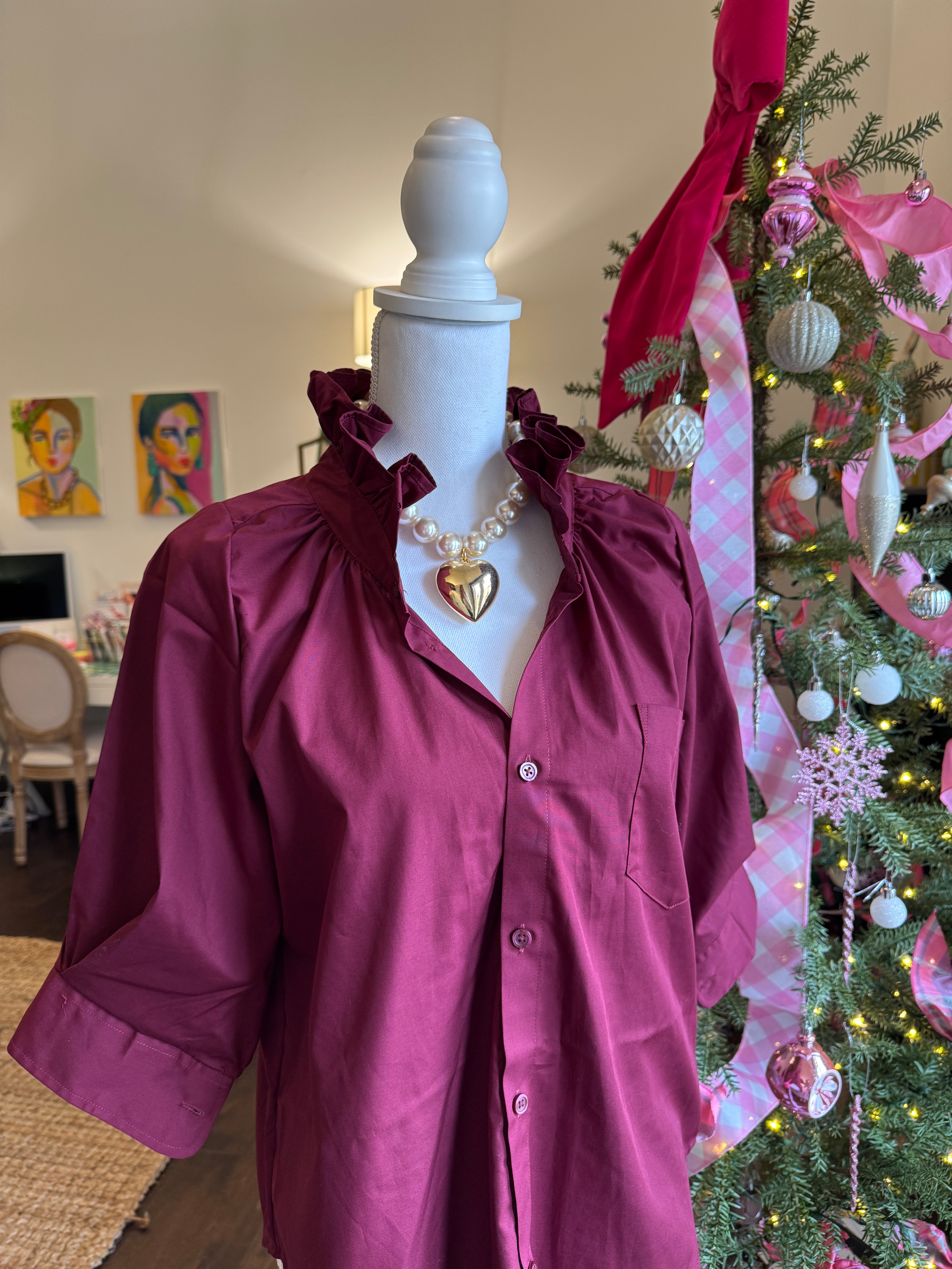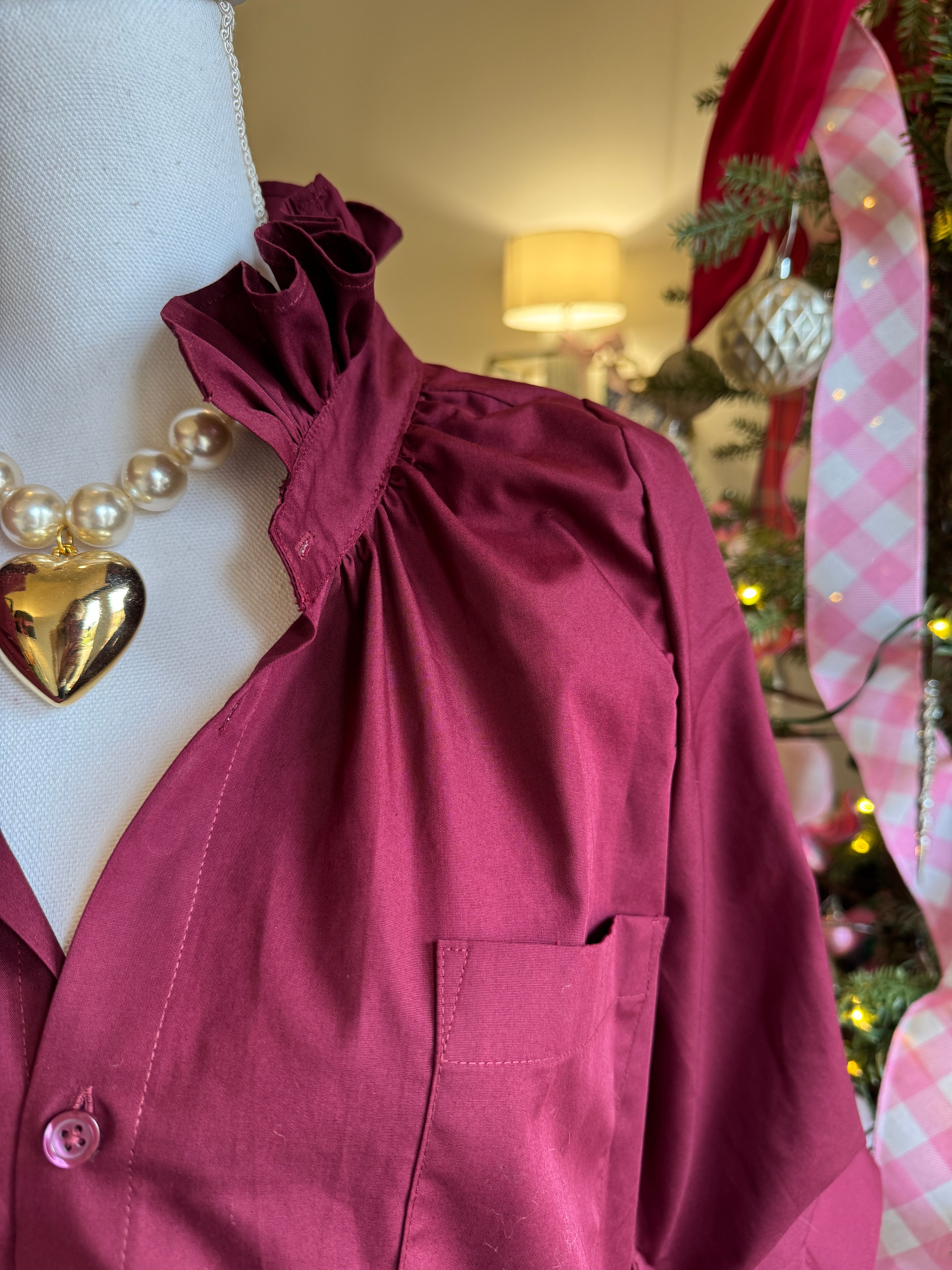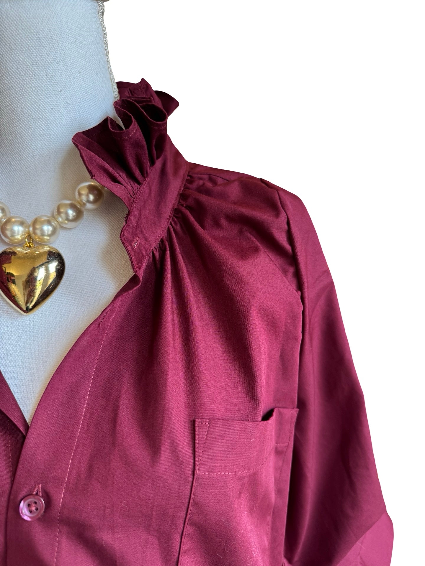 Hey, Southern Lover! This Southern-inspired delight has 3/4 puff sleeves that gracefully sit right above the elbow. Accentuated by an inverted pleat at the cuff and adorned with our signature ruffle collar, this gal gives you the confidence you need to conquer the day.
