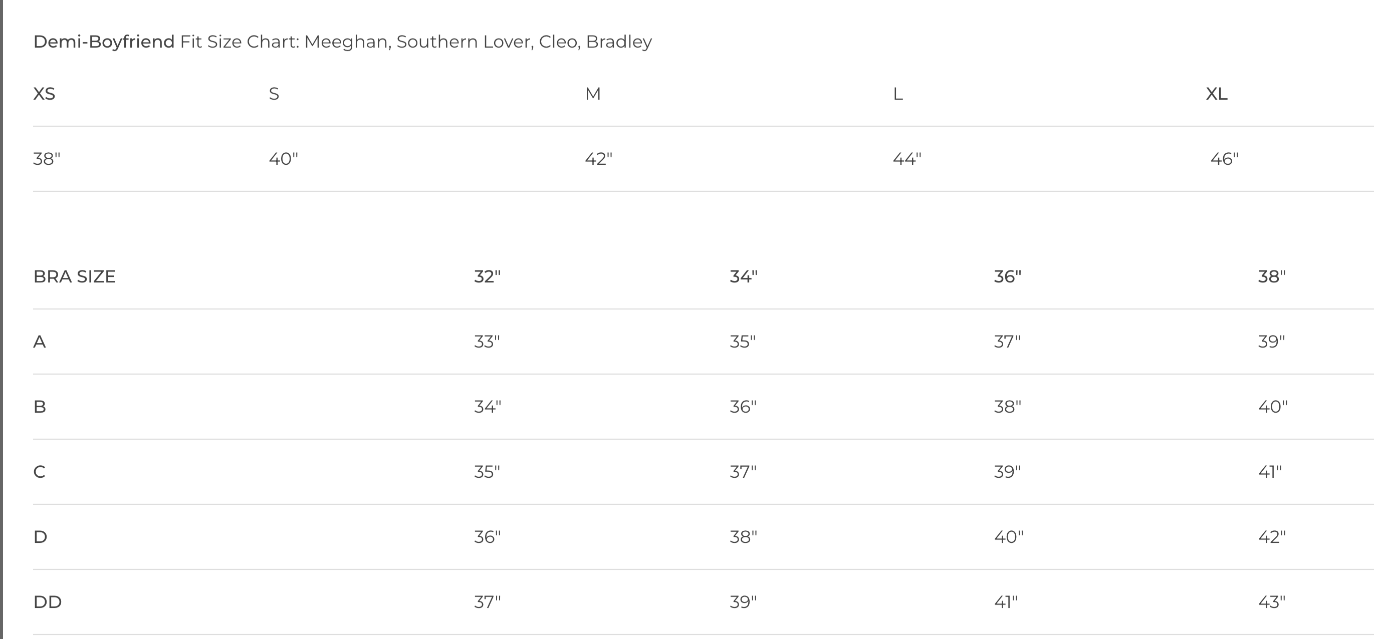 Demi-Boyfriend - A slightly slimmer fit than Boyfriend, and slightly looser than Femme. A-line silhouette. Right in the middle, we say buy in your size, or size down for more fitted.