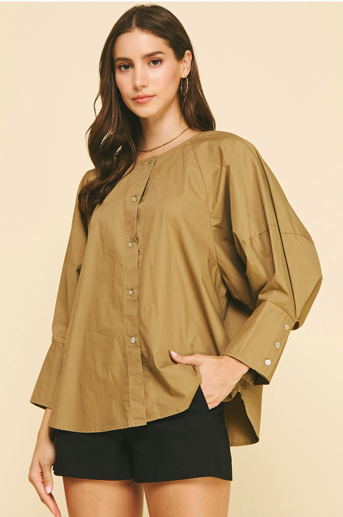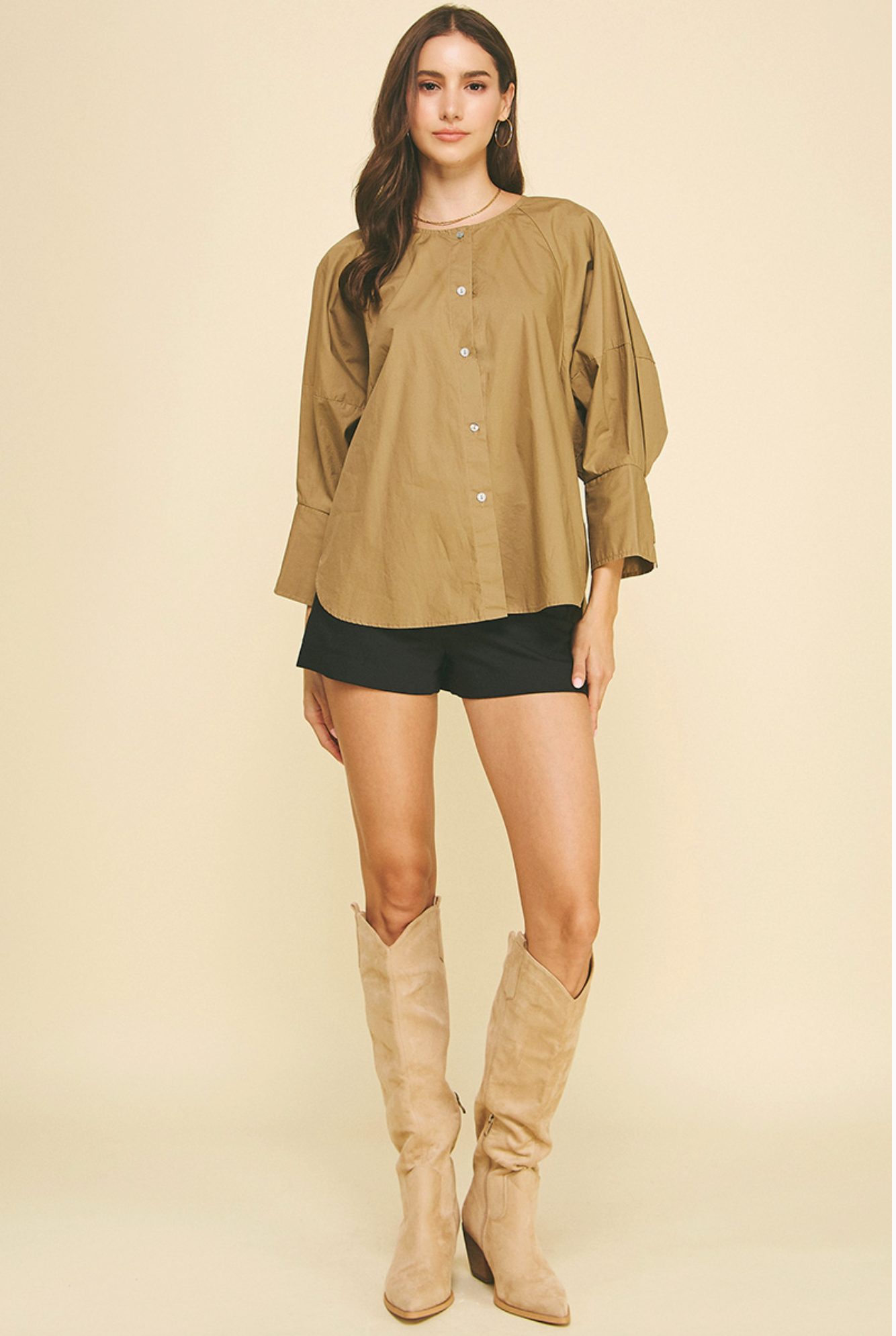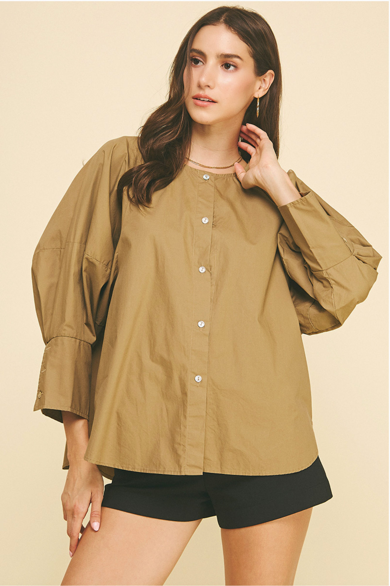 Ready for any occasion, this khaki button-down blouse is perfect for a day at the office or a night out. With a round neck and statement sleeves featuring a three button cuff, this loose-fitting top will add a touch of sophistication to your wardrobe. The model wears a size small.