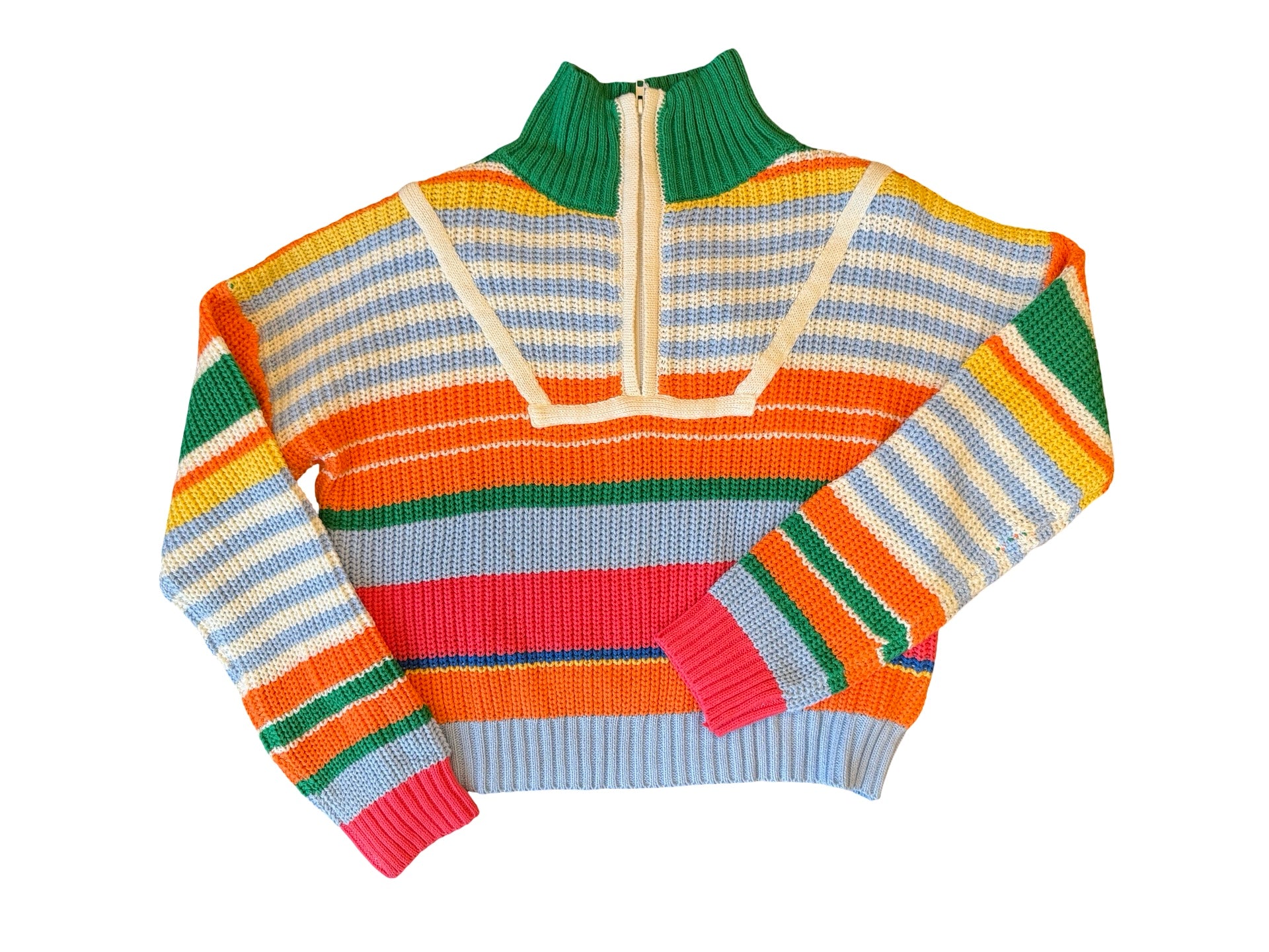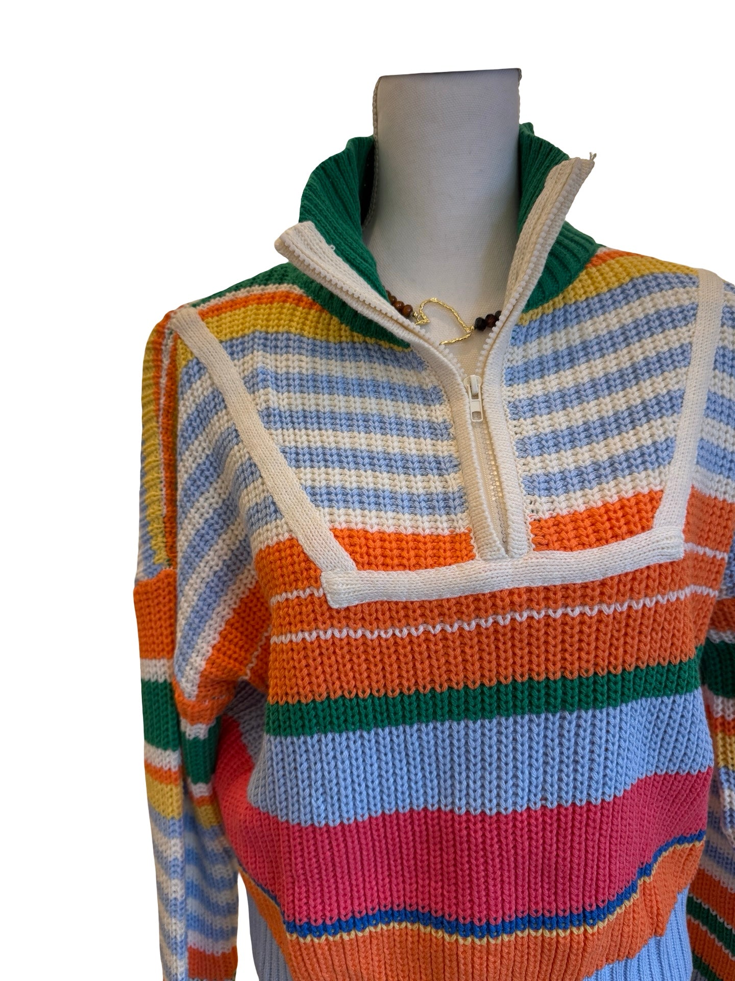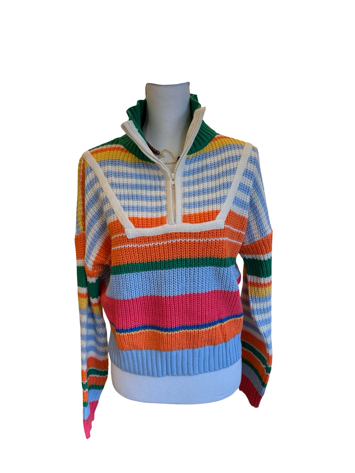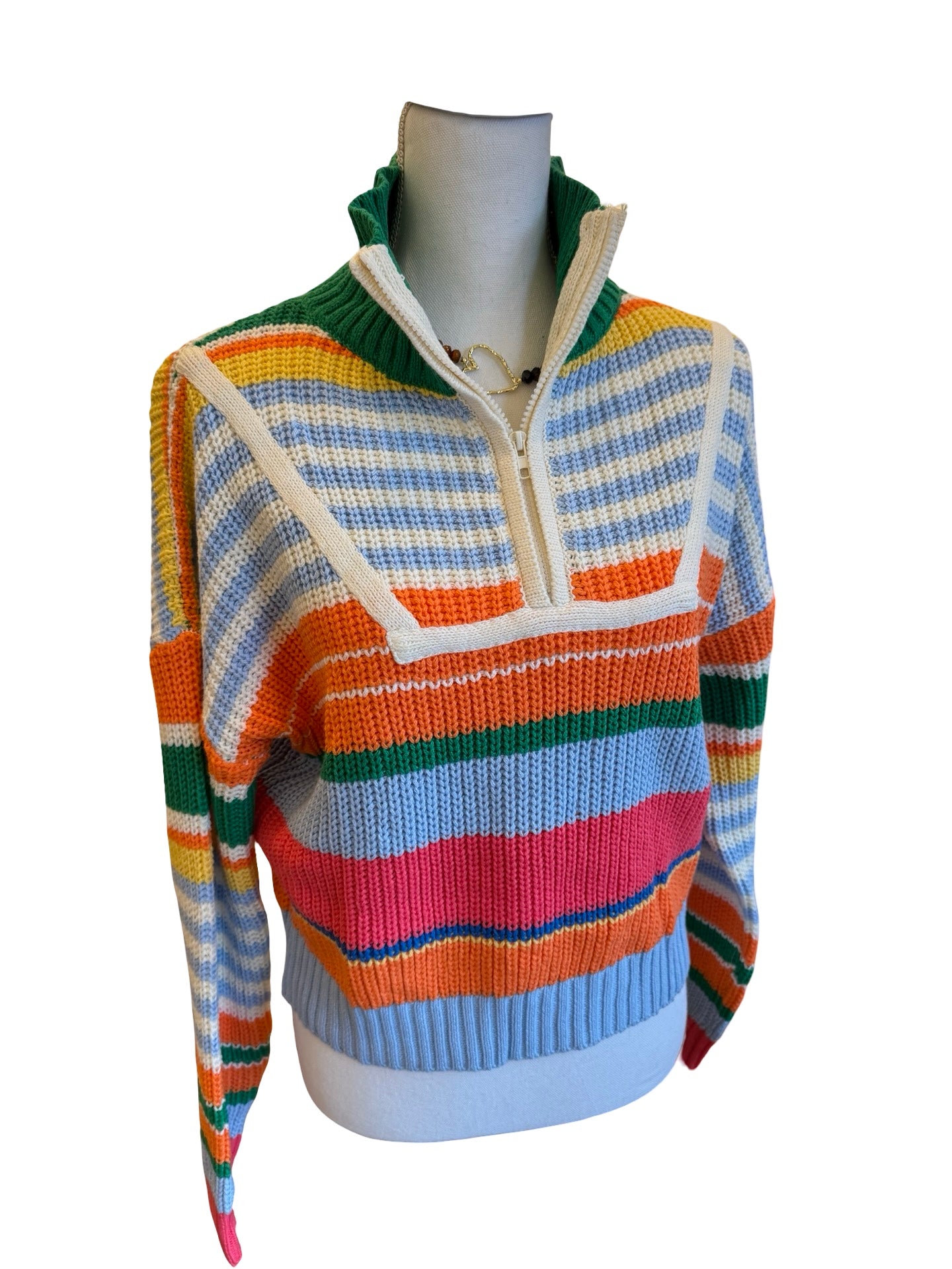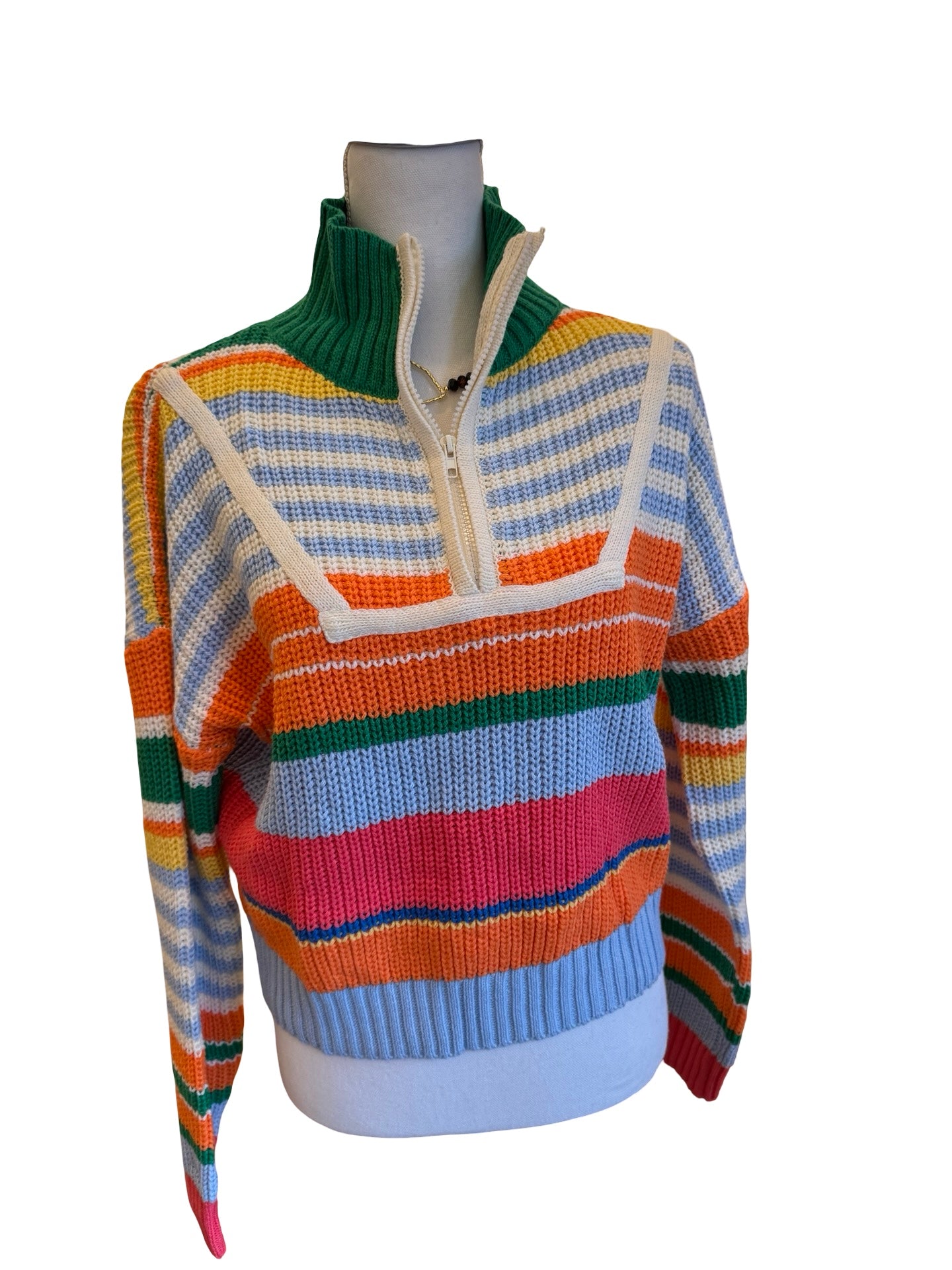 Elevate your casual wardrobe with this versatile multicolor half zip striped sweater. The bold horizontal stripes add visual interest and dimension, while the half zip design offers easy layering and temperature control throughout the day. Crafted for comfort and style, this piece transitions seamlessly from weekend outings to relaxed office settings. Perfect for pairing with jeans, chinos, or joggers, it's the go-to sweater that works harder than you'd expect. Make it your new seasonal essential.