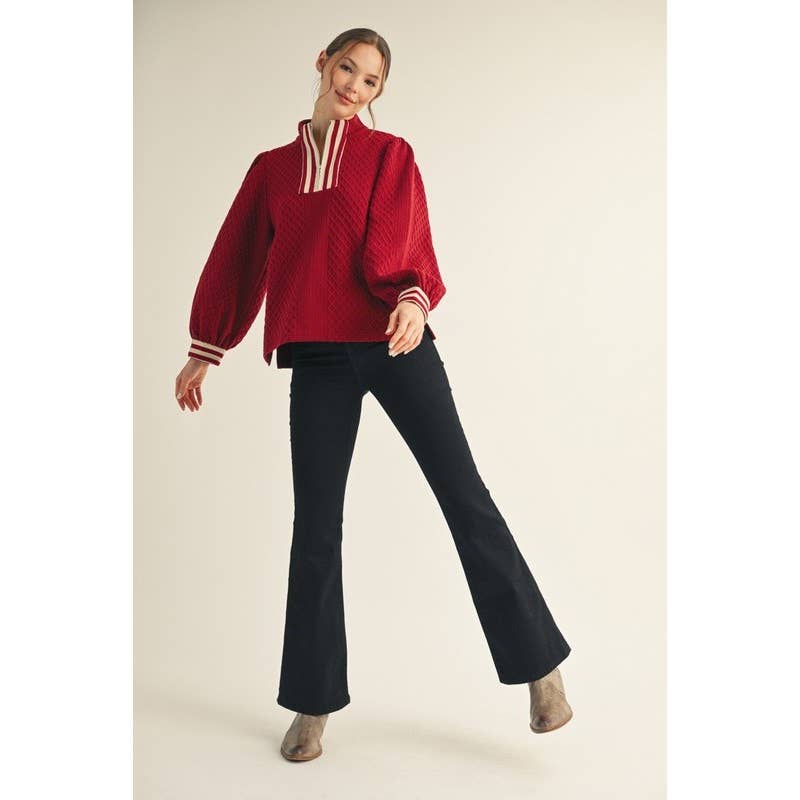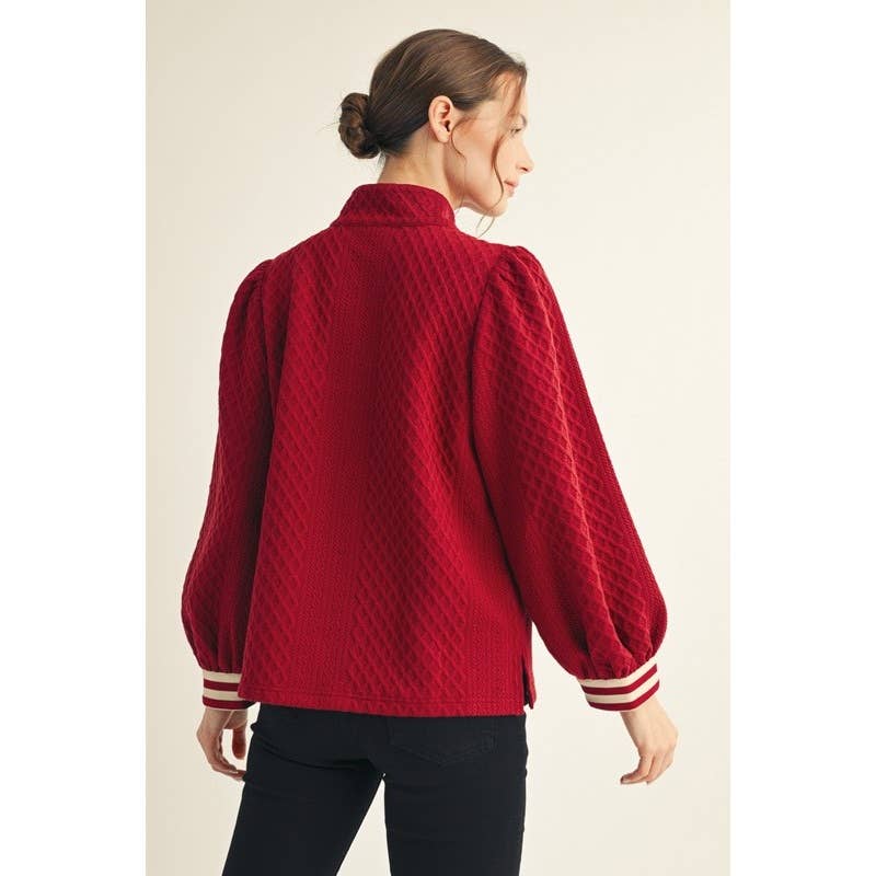 - Front Zip Up Textured Top - Long puff sleeves textured fabric front zip up top, mock neck, stripe contrast detail, side slit.