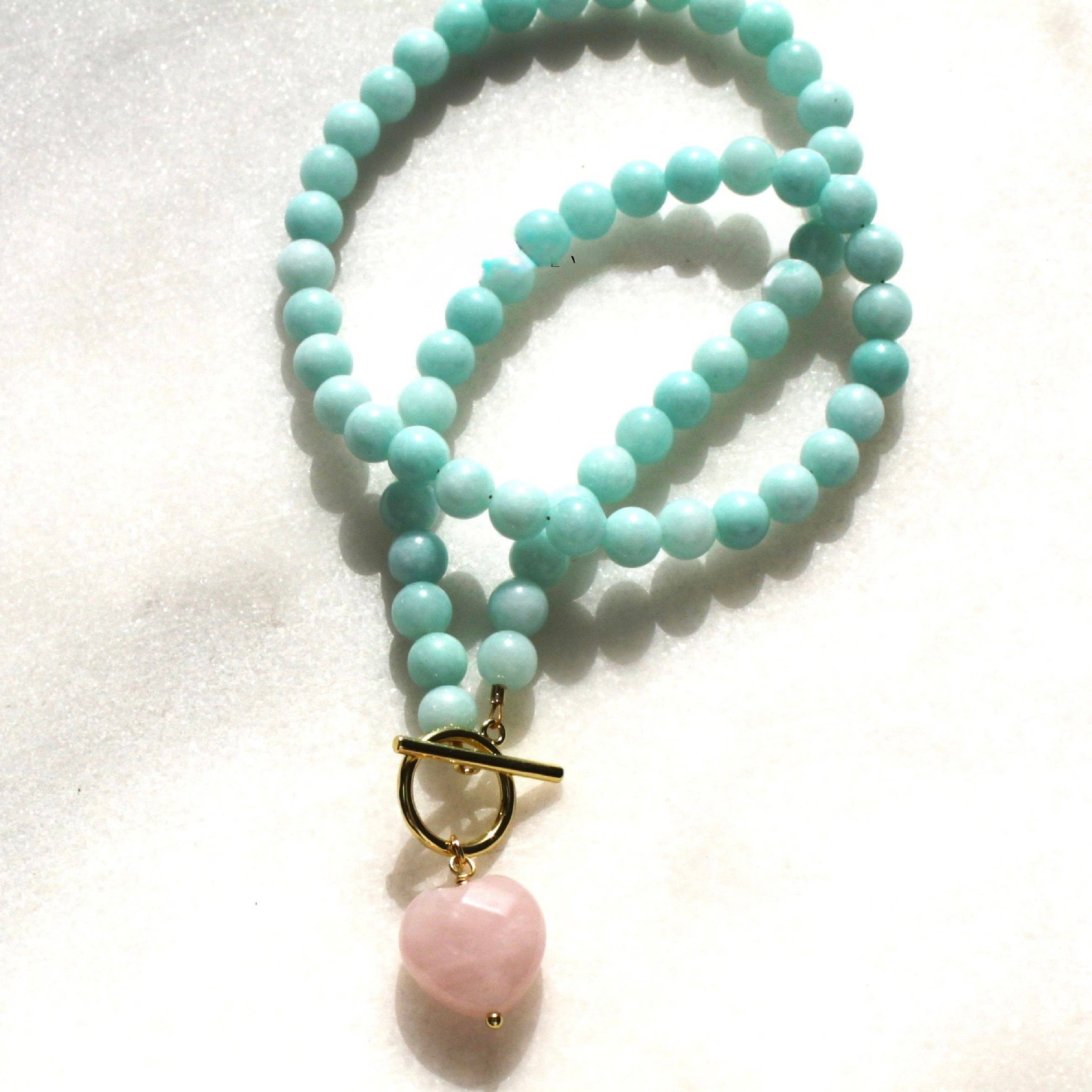 •Gorgeous and natural 6mm aqua jade & rose quartz heart pendant
