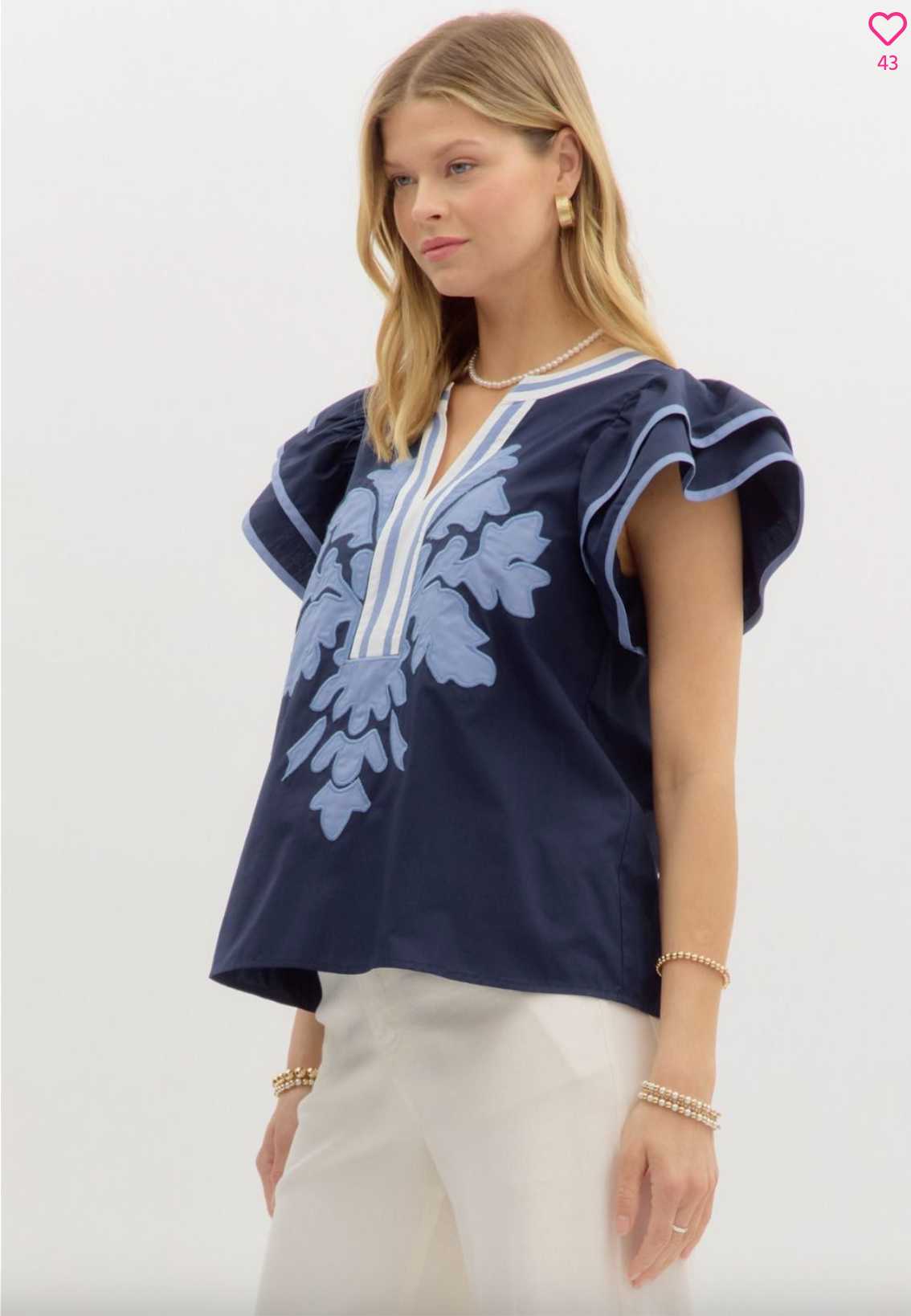 This navy pullover blouse features elegant flutter sleeves and a flattering V-neckline, enhanced by colorful embroidered appliques on the front. Crafted from lightweight woven fabric, it offers comfort without sheerness or lining, making it perfect for stylish, breathable wear all day long.