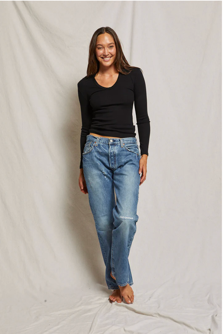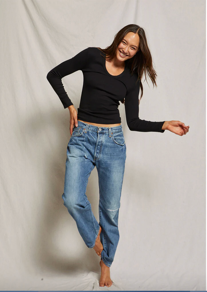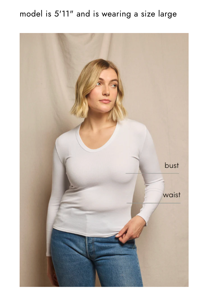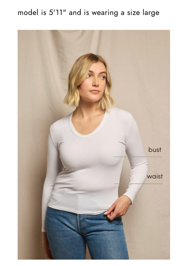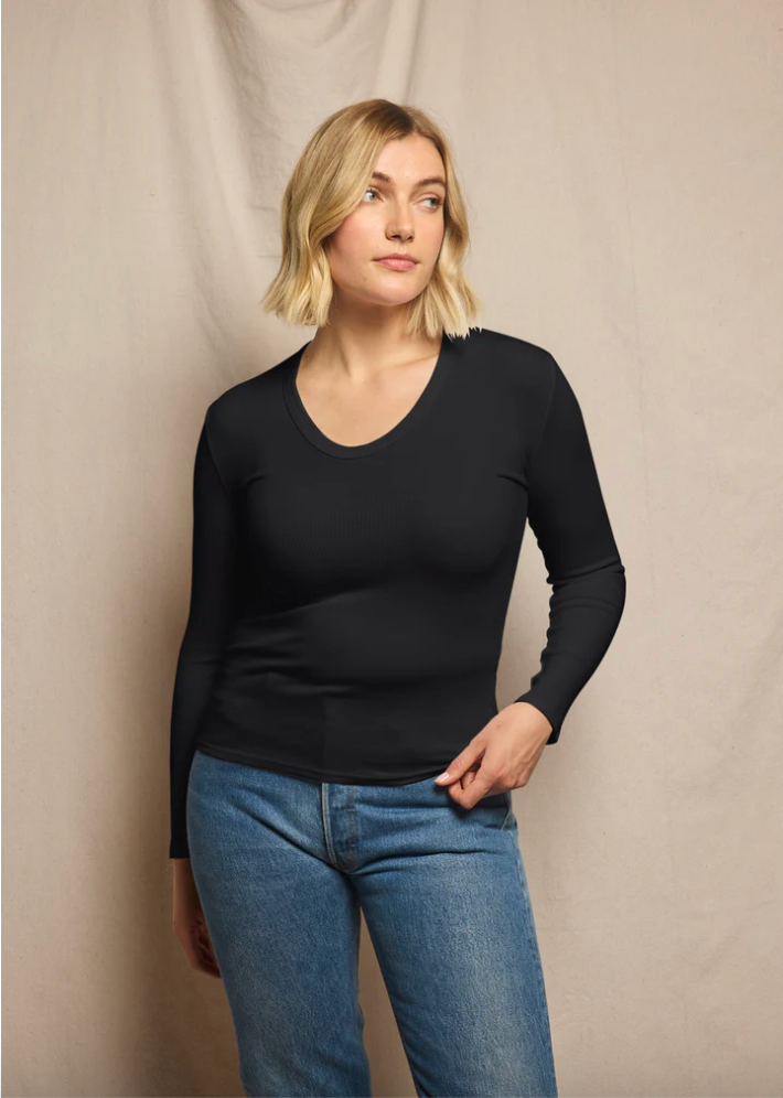 perfectwhitetee upped the game for fall and added this sexy, slinky, cotton rib that works for every body type. made from 90 cotton/10... an ultra deep u-neck and only in the most elevated color, black, perfect for date night or layering.